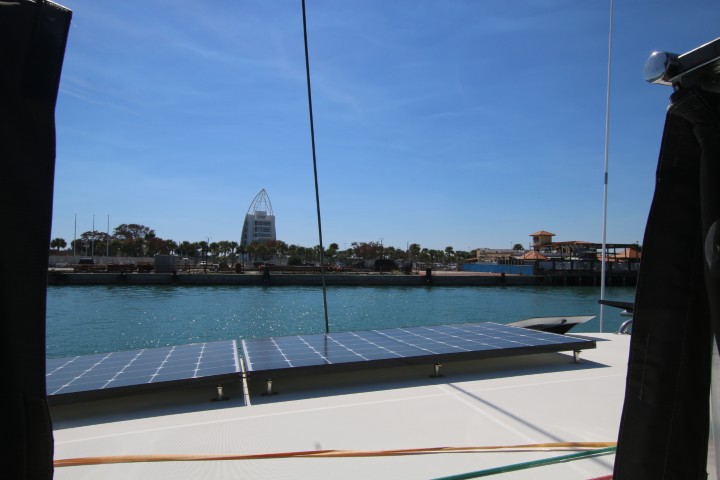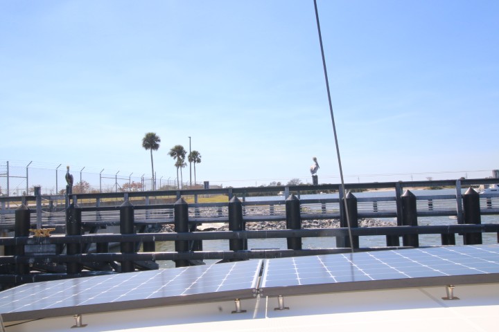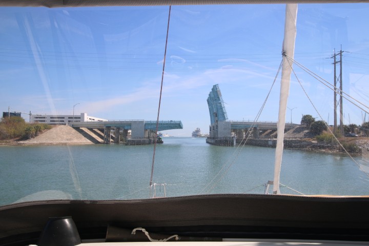 Gegen 11 Uhr beginnt dann das Anker-Auf-Manöver. Allein heißt das ja rennen von vorne in den Steuerstand und zurück. Klappt aber wunderbar. 10 Minuten später kann ich die Schleuse anfunken. Heute dann ohne Delfine oder Manatees. Dafür mit einem anderen Motorboot. Die Schleusung nutze ich, das Groß klar zu machen.