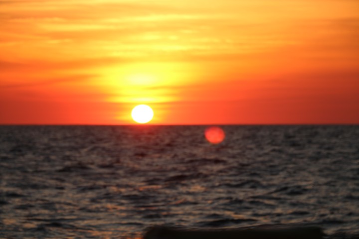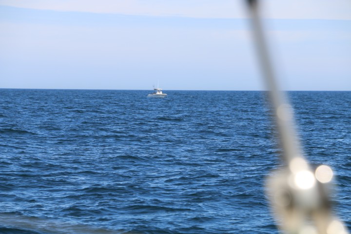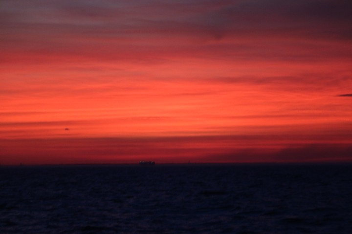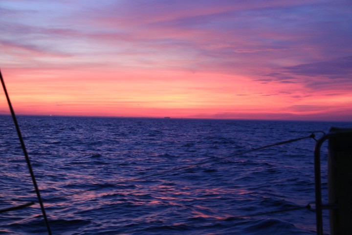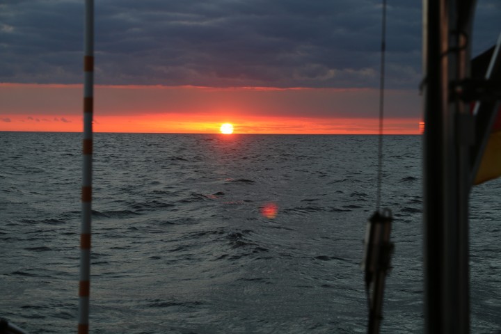 Äußerlich ist nicht viel geschehen. So beginnt der Tag mit einem wunderbaren Sonnenaufgang und endet mit einem ebenso rotem Untergang. Von der Nacht kann ich nur berichten: Ruhig, kein Schiff gesehen, sanft gesegelt.