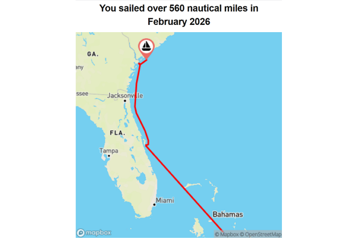 In einer Mail bekomme ich mitgeteilt, dass RE im Februar über 560 Meilen „gemacht“ hat. Das zählt die App „NoForeignLand“ mit. Leider vergesse ich oft, sie mitplotten zu lassen. Aber ich gelobe Besserung! (Steht jetzt mit auf der Checkliste „Seeklar machen“.)