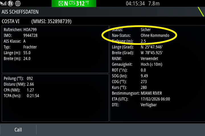 Und da ich heute nicht mal ein Foto gemacht habe, suche ich eine alte Geschichte raus: Da begegnen einem die ulkigsten Gefährte auf See – und das meist bei Nacht. So auch dieses! „Ohne Kommando“ – auf gut deutsch: Ein unbemanntes Fahrzeug. Iimmerhin 55x24 m groß und mit fast 10 kn unterwegs. Aber auch unbemannt hält er brav etwas über 1 Meile Abstand. Danke!