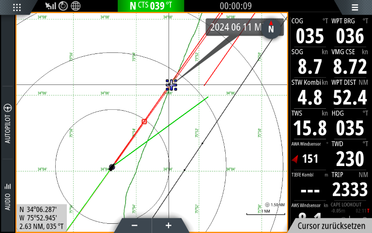 Kurz nach Mitternacht bin ich exakt auf der Position, auf der ich am 11.06.24 mittags war. Auch damals einhand, auf dem Wege nach Norfolk. Nun kalkuliere ich und hoffe, dass ich wieder 1,5 Tage brauche. Dann würde ich es noch am Freitag nach Cape Charles schaffen!