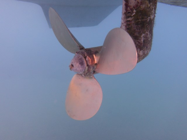 Vorm Ankeraufgehen will ich noch die Propeller fertig putzen. Wird aber nichts. Den Steuerbord-Prop bekomme ich gut hin. Aber auch noch nicht fertig. Dann ist meine Flasche leer geatmet und ich beende die Arbeiten für heute. Nächste Mal ankern, dann wird es fertig gemacht. Nun blitz er schon fast wieder wie neu.