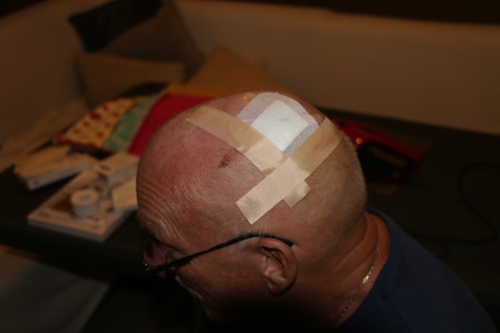 Einen frisch gewaschenen und damit hoffentlich recht sterilen Lappen gegriffen und auf den Kopf gedrückt. Dann erst mal abduschen, dass ich unter dem ganzen Blut die Wunde finde. Ist recht klein. Ordentlich drücken, die Blutung stoppen und ich kann das erst Mal unseren reicht bestückten Notfall-Koffer nutzen! Die erste Gaze ist recht schnell durchblutet, aber dann kann ich ihn mit Stripe-Pflastern die Risse zusammenziehen. Die Blutung stoppt und ich kann Kurt in die Ecke setzen, ihm ein Bier geben und das Boot abwaschen.