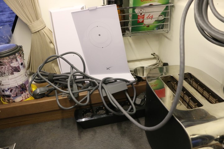 Für uns bedeutet das, dass wir nun überall auf der Welt und insbesondere auf dem Atlantik Internet haben. Zunächst als Sicherheit in Form von einer großräumigen und langfristigen, stets aktuellen Wettervorhersage. Mit Kurzwelle hatte ich ja schon oft beschrieben: Nur kurzfristig, räumlich eng begrenzt und nur recht grob konnte ich mir „Wetter“ runter laden. Geschwindigkeit zwischen 100 Byte pro MINUTE und wenn es mal super lief, dann Richtung 20.000 – aber immer noch Byte pro MINUTE. Nun mit StarLink haben wir über 50 MB/s. Das sind Geschwindigkeiten, die wir an Land übers Handynetz nicht hin bekommen! Noch liegen die Geräte in der Pantry provisorisch angeschlossen und ziemlich im Weg. Aber das soll sich demnächst ändern.