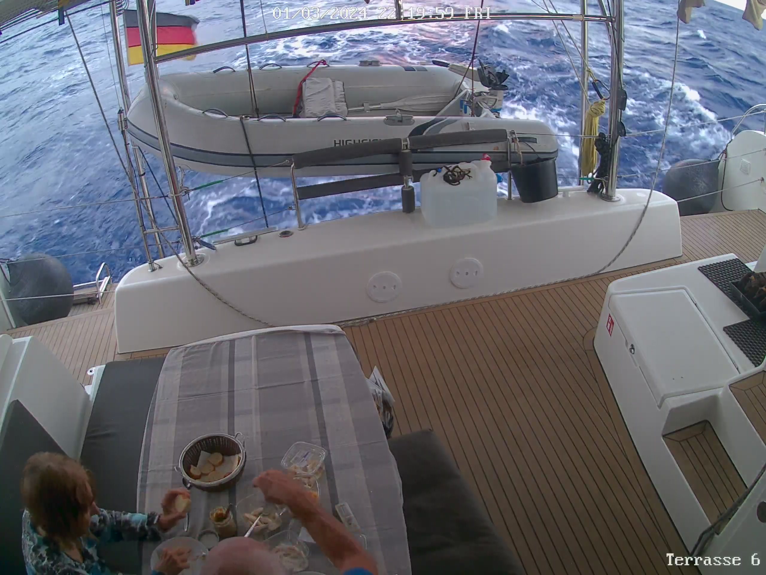 Doch zunächst steht Abmeldung auf dem Programm. Wieder zu „meinem“ Hafen-Officer. Damit es etwas schneller geht und um nicht so viel schleppen zu müssen, aktiviere ich das eBike. Damit ist dann der erste Teil, in den „Port“ fahren und abmelden schnell erledigt. Und: Nachdem ich aufgerufen werde, geht es blitzschnell. Und es fallen keine weiteren Gebühren an! Zack – stehe ich schon wieder draußen. Und ab zum Super-U. Ein wenig Bier und ganz besonders Essig in allerlei Varianten. Dazu dann – eBike schleppt ja – noch 8 Liter Saft. Das Ganze ins Dinghy und dann weiter zum Continente. Mit Zwischenstopp in 2 Baumärkten. Diese leider erfolglos. Im Continente hatte ich Fisch-Salate entdeckt. Die gibt es heute Abend! Dazu hat er die bessere Obst- und Gemüseabteilung. Incl. Kokosnuss. Monika soll ja schon noch berichten können, dass sie in der Karibik war!
