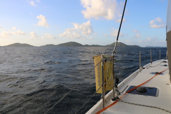 Monika erfüllt sich heute Nacht einen Wunsch, den sie gleich nach der Ankunft geäußert hatte: An Oberdeck übernachten! Sie hatte da wohl an das Trampolin gedacht, doch bei dem etwas stärkeren Wind entschließt sie sich dann doch für die Terrasse. Wir sind zu schnell! (Whow – dass ich das mal zu der Segelei mit RE sage!) So kämen wir im Dunklen in den schwierigen Teil der Passage. Deshalb kürzen wir die Segeln um 01:30 noch mal ein: Reff 3 ins Groß, die Fock bleibt nur noch als Fetzen stehen. Immer noch machen wir 4 Knoten. Aber damit erreichen wir die Virgins gegen halb fünf – eine gute Stunde vor Dämmerung. Mit gut 2 Meilen Abstand zur Küste sollte das mit GPS und guter Sicht noch kein Problem werden. Ein längerer Schlag dann an Virgin Gorda vorbei und wenn es ans Andrehen nach Süden geht sollte schon genügend hell sein!