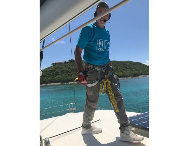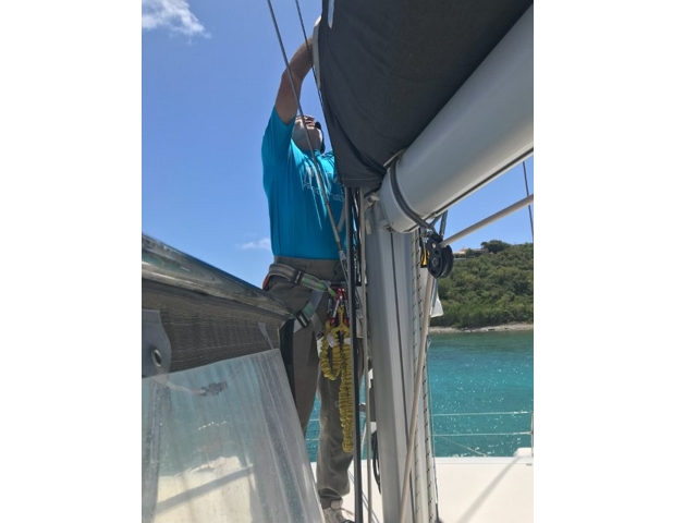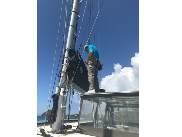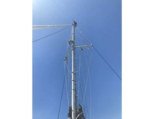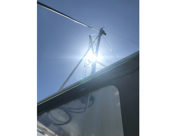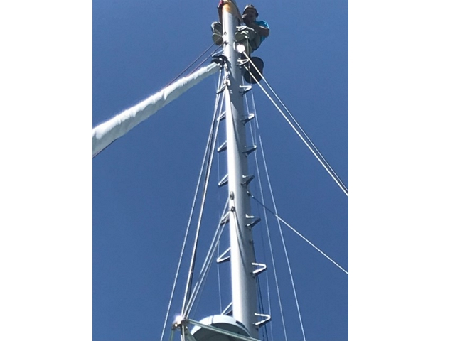 Dann steige ich in den Mast – nach der Atlantik-Querung alles kontrollieren und das Strobe-Licht richten, das funkelt nach unten, da ist was kaputt. Am Ende mache ich es nur provisorisch, da muss ich bei der nächsten Besteigung einen Masseklebstoff mitnehmen..
