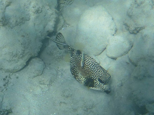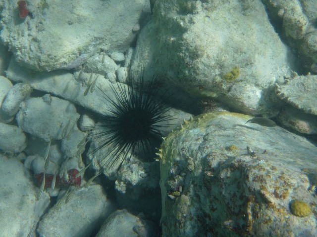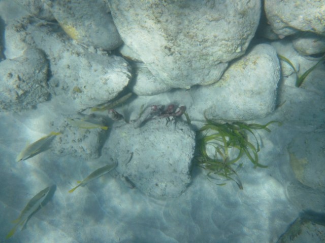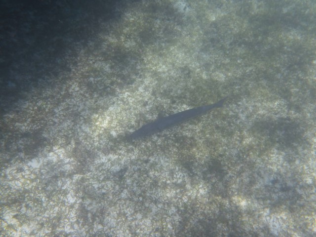 Dann eine Runde schwimmen, der Barrakuda steht noch immer brav unter RE, die Schiffshalter finden uns wohl langweilig – sie sind weg. Dafür haben wir einen kleinen Stachelrochen unter dem Backbord-Rumpf und eine Schildkröte am Anker. Die findet mich gar nicht nett und entschwindet. Eine etwas größere backbord querab passt auf mich auf und grast erst weiter, als ich mich davon mache…