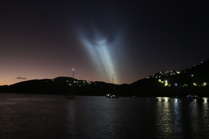 Whow! Nun haben wir uns wahrlich einen Sundowner verdient. Und ich mache – auf Monikas Wunsch als Abschiedsessen: Kartoffelwaffeln. Peter und Doreen wollen noch Anna und Nico rüber holen. Wie wir ihr Dinghy klar machen gibt es eine seltsame Erscheinung am Westhimmel. Ein riesiger „Engel“ erscheint da! Irgendwer ruft dann: Ein Raketenstart! ??? Ja – das ist es! Dann kommt die Trennung vom Booster und die zweite Stufe beschleunigt dann noch mal. 38 neue StarLink-Satelliten gehen da gerade in ihre Umlaufbahn! Doreen hat das Ganze gefilmt, ich mache Fotos. Danke an Doreen, dass ich den Film hier zeigen darf!