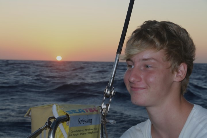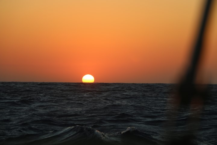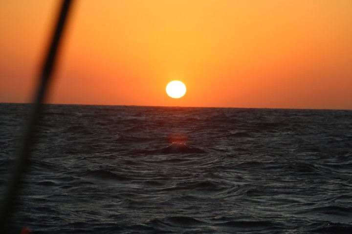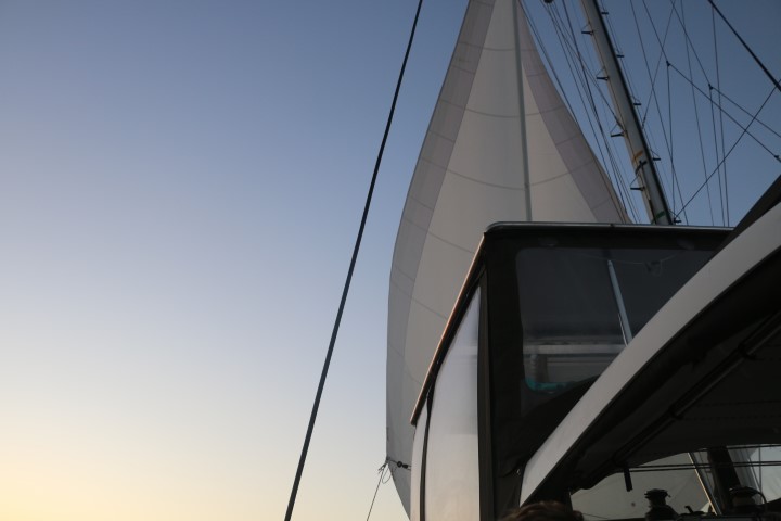Der Tag beginnt früh: Um 00:00 Uhr! Nico kommt und berichtet, dass der Wind recht schwach und sehr achterlich ist. Fock schlägt nur noch, Fahrt machen wir nur wenig. Also: Para setzen. Eigentlich kein Problem, wenn man zu zweit ist. Doch heute geht alles schief! Nix Böses, aber…. Ich lasse ihn hochziehen, während die Fock noch steht. Dann die Fock weg. Und dabei bekomme ich Angst, dass beim Eindrehen der Fock Leinen oder Teile vom Para „eingefangen“ werden. Also: Decksbeleuchtung aus, denn die blendet, Taschenlampe an – ich kann nichts erkennen. Brille holen, und unsere Scheinwerfer-Lampe (5.000 Lumen!!): Ok – sieht alles frei aus. Also: Para öffnen. Dazu wird der Schlauch hoch gezogen. Nur – nach der Hälfte geht nichts mehr. Wieder Lampe: Oh – die Schlauchleine liegt um den Schlauch herum und „würgt“ ihn nun. Shit – Schlauch wieder runter. Schlauchleine auf die andere Seite. Doch dazu müssen die 4 Schoten einmal ab, Schlauchleine rum, 4 Schoten wieder ran. Dann geht es von vorne los. Ooops – Schlauchleine „würgt“ immer noch. Oh, Doppelshit! Die war gar nicht um den Schlauch, also nicht komplett. Hatte nur eine Bucht um den Schlauch geschlagen. Ich hätte sie also nur gerade ziehen müssen. Aber nun ist sie ja einmal „rum“. Wieder von vorne: 4 Schoten ab, Leine rüber, 4 Schoten an. Nun endlich klappt es. Hurra! Doch kaum im Steuerstand scheint der Para „runter“ zu kommen. Oh weh – ist das Fall gerissen?? Lampe, hochschauen – nein. Ach – das Groß nimmt den Wind so, dass es den Para runter drückt. Also nun endlich Groß bergen. Dann ploppt der Para auf und wir segeln wieder. Blick auf die Uhr: 01:00 Uhr!