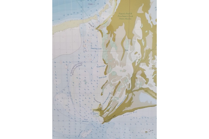 Dann wird es spannend. Ein Fahrweg windet sich durch die Untiefen. Ich bin da ja mit den gestrigen Erfahrungen etwas misstrauisch. Sitze die ganze Zeit im Steuerstand und starre auf den Tiefenmesser. Die Wasseroberfläche ist glatt und türkis-blau. Da ist nichts zu sehen. Aber zu beiden Seiten des Fahrweges sind Tiefen, die auch RE nicht überfahren kann. Von Land aus muss es irre aussehen, wie wir da haken-schlagend durchs Wasser dampfen. Ich probiere den Autopiloten im „Navigations-Modus“. Gebe 25 Punkte ein, die er abfahren soll. Klappt prima. So kann ich mich auf Beobachten konzentrieren, wie RE selbst den Weg abfährt.