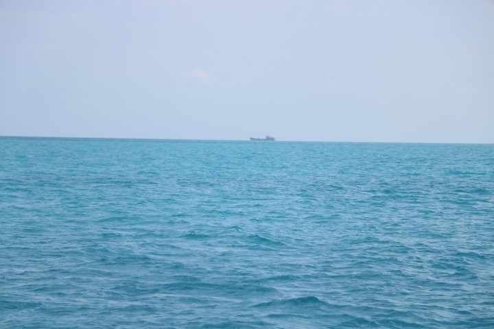 Wenige Minuten später ist der Anker auf und wir fahren Richtung Außenriff. Dort könnte ein Treffpunkt mit der VITAMIN SEA liegen. Am Horizont fährt ein kleiner Frachter – na dann wird es für uns ja tief genug sein. Eine halbe Stunde später entdecke ich dann: Sieht aus wie ein fahrender Frachter, ist aber ein aufgelaufenes Wrack!