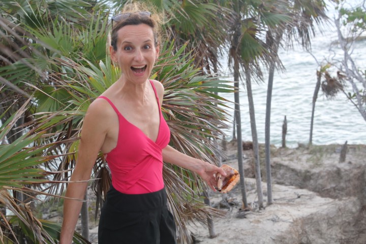 Auf der anderen Seite der Insel dann einen kleinen Strand-Spaziergang bis zur Huk, von der wir unseren alten Ankerplatz sehen. Und zurück dann mit „Strand-Fund“. Ein schönes Schneckengehäuse hat es Doreen angetan. Nur: Da läuft ekliger Sapsch raus. Stinkt gewaltig. Da halte ich es dann lieber mit ein wenig Abstand…