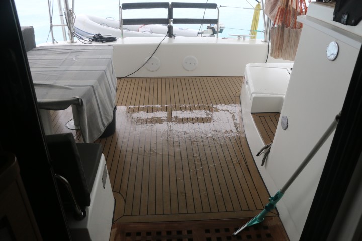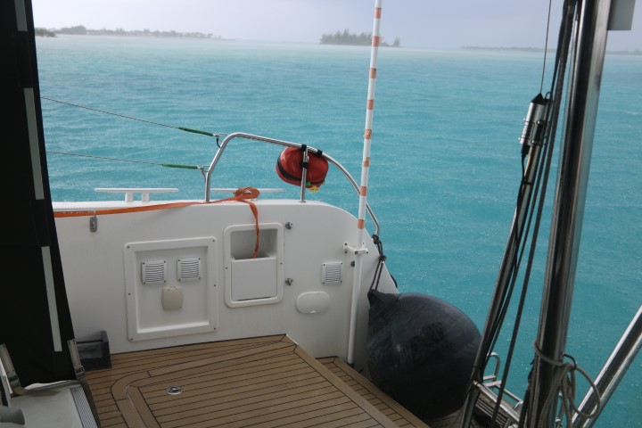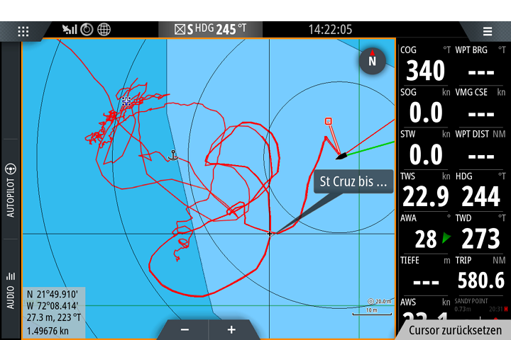 Auf der VITAMIN steht heute Besucher-Wechsel an. Leo fliegt nach Hause und Doreens Bruder kommt. Bei dem Wetter verlegen sie dazu vor die Marina. Ich warte auf den vorhergesagten Regen. Und der kommt! Mit sehr frischen Böen! Ich stehe dann im Steuerstand. Der Anker wird ein wenig durch den Grund geschliffen. Vielleicht wären 40 Meter Kette plus Hahnepot doch besser gewesen? Doch am Ende hält er. Vielleicht 10 Meter bin ich weiter geschliffen worden.