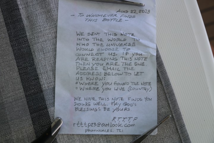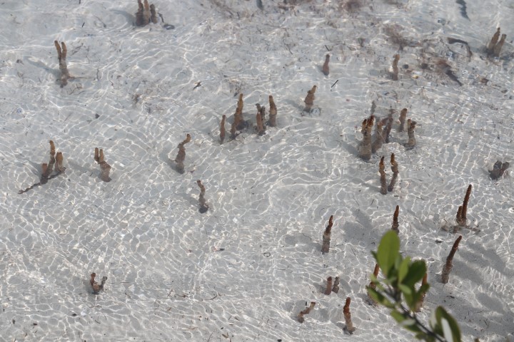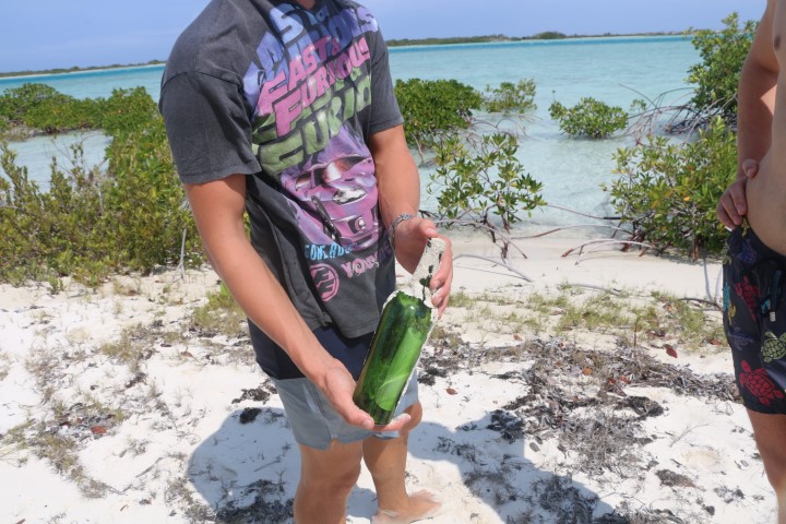 Morgens gibt es wieder „Einsatzbefehl“ von Doreen: Mangroven anschauen! Wir liegen ja hier inmitten von Mangroven. Ob es eine „Nursery“ ist? Ich hatte irgendwo etwas Entsprechendes gelesen, finde es aber nicht wieder. Zumindest sind im flachen Wasser ganz viele Stecklinge zu sehen. Und wirklich hoch ist hier, auf der nördlich vom Ankerplatz liegenden Insel keine der Mangroven. Also alles Jungbestand. Dann der Knaller: Anna findet eine Flaschenpost. Nun ist kein Halten mehr – sie will zurück. Mit Zwischenstopp auf RE, wo die Flasche feierlich geöffnet wird. Der Text wird verlesen. Einig sind wir uns: Schade, die Absender sagen nicht, wo sie die Flaschenpost ins Wasser gegeben haben. Eine E-Mail-Adresse steht unten. Anna will uns auf dem Laufenden halten, was sie für Antworten bekommt. Schaun mer mal!