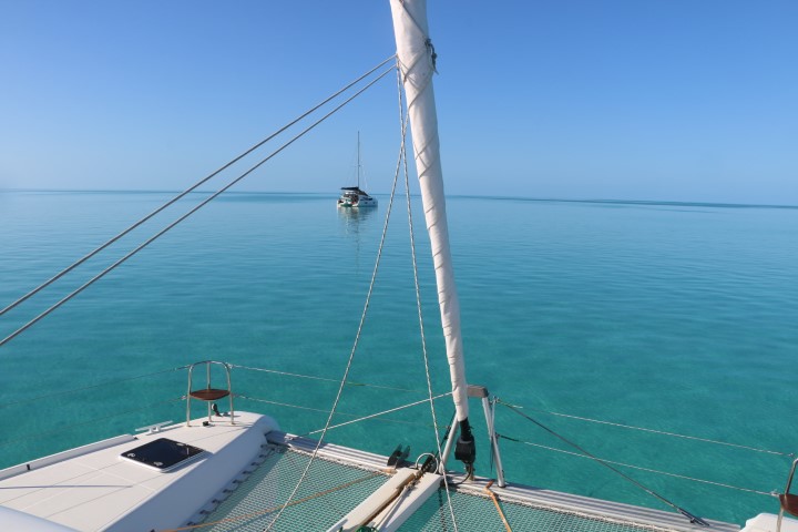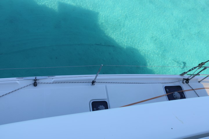 Der Blick aus dem Badezimmer ist ungewöhnlich: Ich sehe die Ankerkette auf dem Grund am Boot längs laufen! Und an Oberdeck dann fällt der Blick steuerbord achtern auf den Anker. Ja – es ist so gut wie windstill. Entspricht der Vorhersage, bringt uns dann aber nicht nach Osten – unserem Ziel, den Turks, näher! So beschließt Peter, sein Spi-Fall zu klarieren. Dazu muss er in den Mast. Am Ende zweimal. Und ich soll ihn sichern und bewegen. Mach ich doch gerne. Zum Abschluss gibt es dann frische Waffeln. Und dann eine kleine Pause. Bis zum Seemannssonntag auf RE.