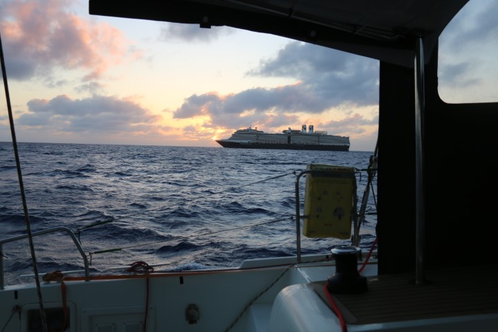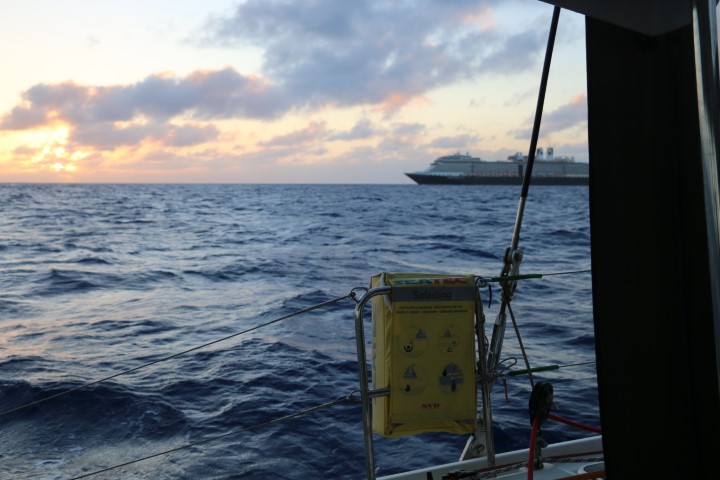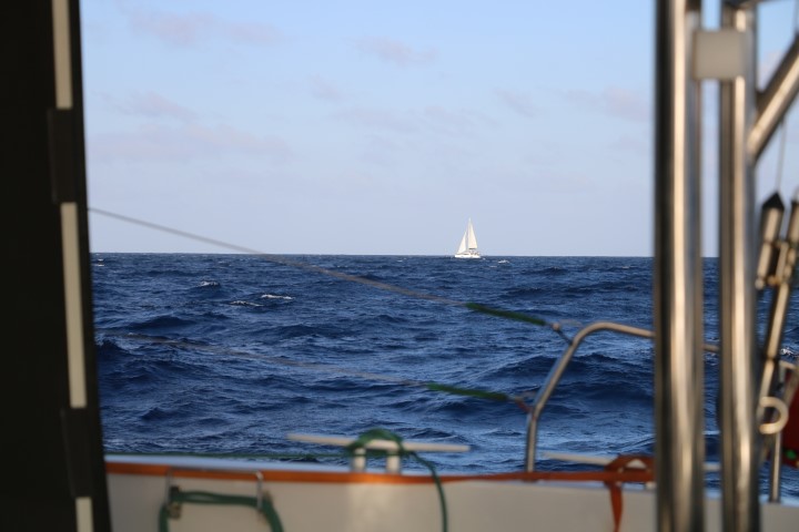 Zunächst geht der Kurs nach Norden und wir versuchen, alles aus RE raus zu holen, dass die VITAMIN SEA uns nicht so abhängt. Als dann der Kurs mehr nach West geht, können wir die Doppelfock setzen und sind (das erste Mal!!) schneller als die VITAMIN! Hurra – wir holen auf! Und ich kann beruhigt schlafen, nicht nur, dass wir uns nicht so sehr abhängen lassen, nein, Nico geht ja Wache! Gute Nacht!