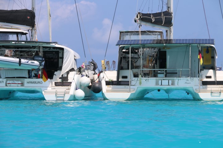 Heute ist Ladetag! VITAMIN SEA wird aufgeladen: Also – die Batterien. Damit hatten sie ja schon auf der Überfahrt hierher Schwierigkeiten. Und die Anzeige des Ladezustandes gaukelt einem nach längerem Gebrauch ohne Voll-Ladung dann vor, dass die Batterie gut geladen sei, ist sie aber nicht. So kommt die VITAMIN längsseits und nimmt die RE als Landanschluss. Peter möche gerne die Ladezeit wissen. Da bin ich vorsichtig. Zu Recht: Am Ende gehen wir gegen 17 Uhr nach fast 10 Stunden Laden wieder auseinander. Nur: Wirklich voll ist die Batterie immer noch nicht. Was heißt: Sie war ziemlich leer. Und ich bin mit dem Laderegler nicht zufrieden. Ob der evtl. nicht auf AGM-Batterien geschaltet ist?