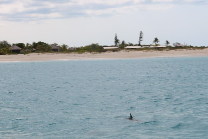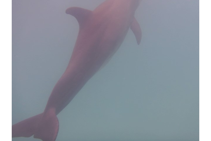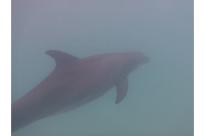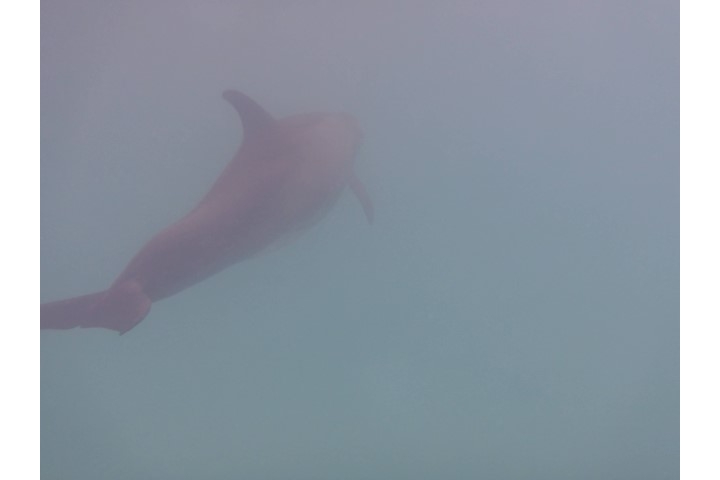 Kurz vor 10 Uhr sehe ich (endlich) einen Delfin an Steuerbord. Endlich hat die Bucht auch für mich den richtigen Namen! Schnell ein paar Fotos machen! Doch da blitzt es in mir auf: Das ist DIE Gelegenheit. Ich falle aus meinen Klamotten und in die Badehose. Maske, Schnorchel und Flossen liegen griffbereit. Oh – Kamera mitnehmen! Und ab ins Wasser. Sie sind immer noch keine 30, 40 Meter von RE weg. Leider ist das Wasser recht trübe und ich befürchte, dass sie schneller weg sind als ich an der letzten Stelle, an denen sie Luft geholt haben. Doch der eine Delfin wartet auf mich! Ganz langsam – also für einen Delfin – schwimmt er weiter. Ich muss mich beeilen, aber bin noch nicht auf Höchstgeschwindigkeit. Also – er, oder ist es eine SIE?, macht einen winzigen und ganz langsamen Schlag mit der Fluke und schon muss ich Gas geben. Es bleibt gerade noch Luft, um mit ihm zu tauchen. Aber ich muss dreimal hoch während er einmal Luft holt! Und dann ist Nr. 2 unter mir. Und ich bekomme einen kleinen Schreck. Etwas berührt mich links. Ich will das wegstoßen – und fasse an einen weiteren Delfin. Das ist der Kleinste. Nach der Schmuse-Einheit mit mir drängt er sich an Nr. 2. Also – jetzt sieht es aus für mich, wie Mutter mit Kind und Kleinkind…