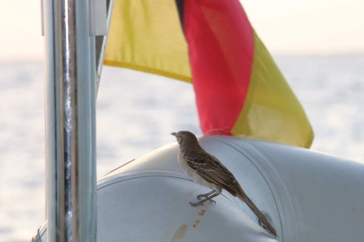 In der Pantry flattert es: Ein Vogel mag mich nicht und will aus dem Fenster. Geht nicht! Doch bis ich den Fotoapparat klar habe, hat er die Tür nach draußen genommen. Nun sitzt er auf dem Schlauchboot und schaut angelegentlich zurück zur Insel. Bleibt aber da. Irgendwann finde ich ihn im Steuerstand. Gut, sage ich, machst Du den Ausguck, ich lege mich mal hin. Doch bei der nächsten Kontrolle sehe sehe ich: Mein toller Ausguck pennt! Nun – muss ich doch alleine alles machen….