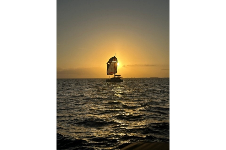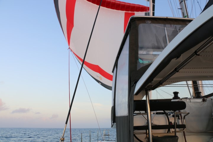 Der Tag beginnt früh – eigentlich kurz nach Mitternacht mit Schlafengehen. Und geht um 5 Uhr weiter – ich wache auf und beschließe, in aller Ruhe loszufahren. Alles klar, Anker auf und auf der Fahrt unter Motor den Para klar machen. Zeitlich passt alles perfekt, an der Außenkante des Riffs ziehe ich den Para auf und endlich ist Ruhe. Nicht allzu schnell, aber das große Segel steht. Hinter mir kommen JUNE und dann bald auch VITAMIN los. Jetzt bekomm ich einen Tee und eine schöne Pause!
