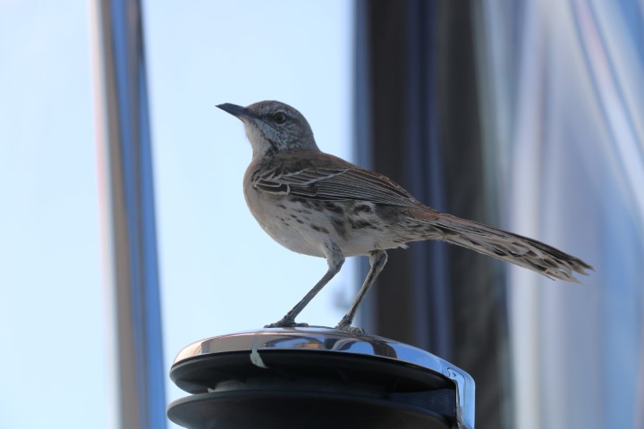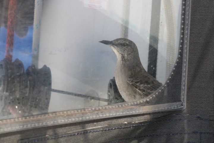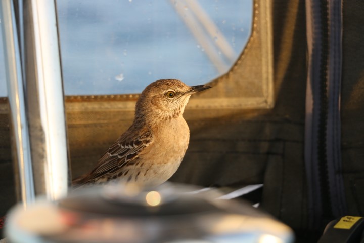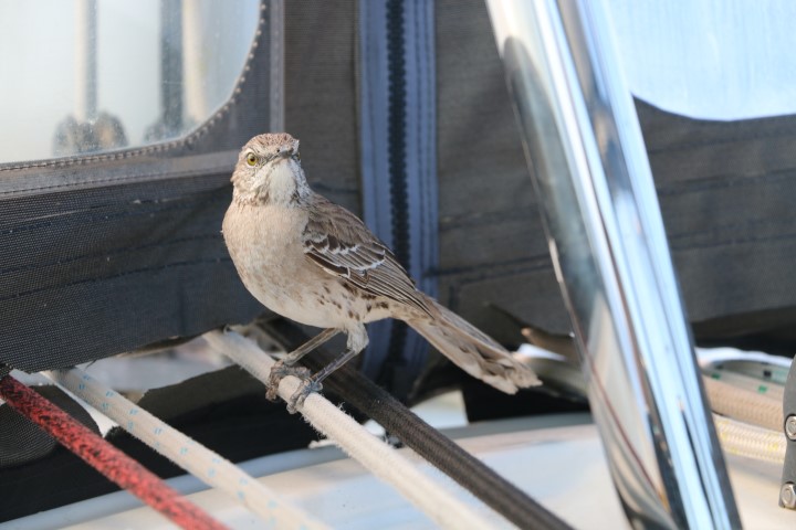 Der Vogel ist nicht besonders zufrieden mit mir, verzieht sich lieber auf’s Dach. Dort wird von achtern bis vorne alles inspiziert. Am Mast findet er dann auf einem Tampen einen netten Platz. Doch bei der nächsten Kontrolle sitzt er wieder im Steuerstand.
