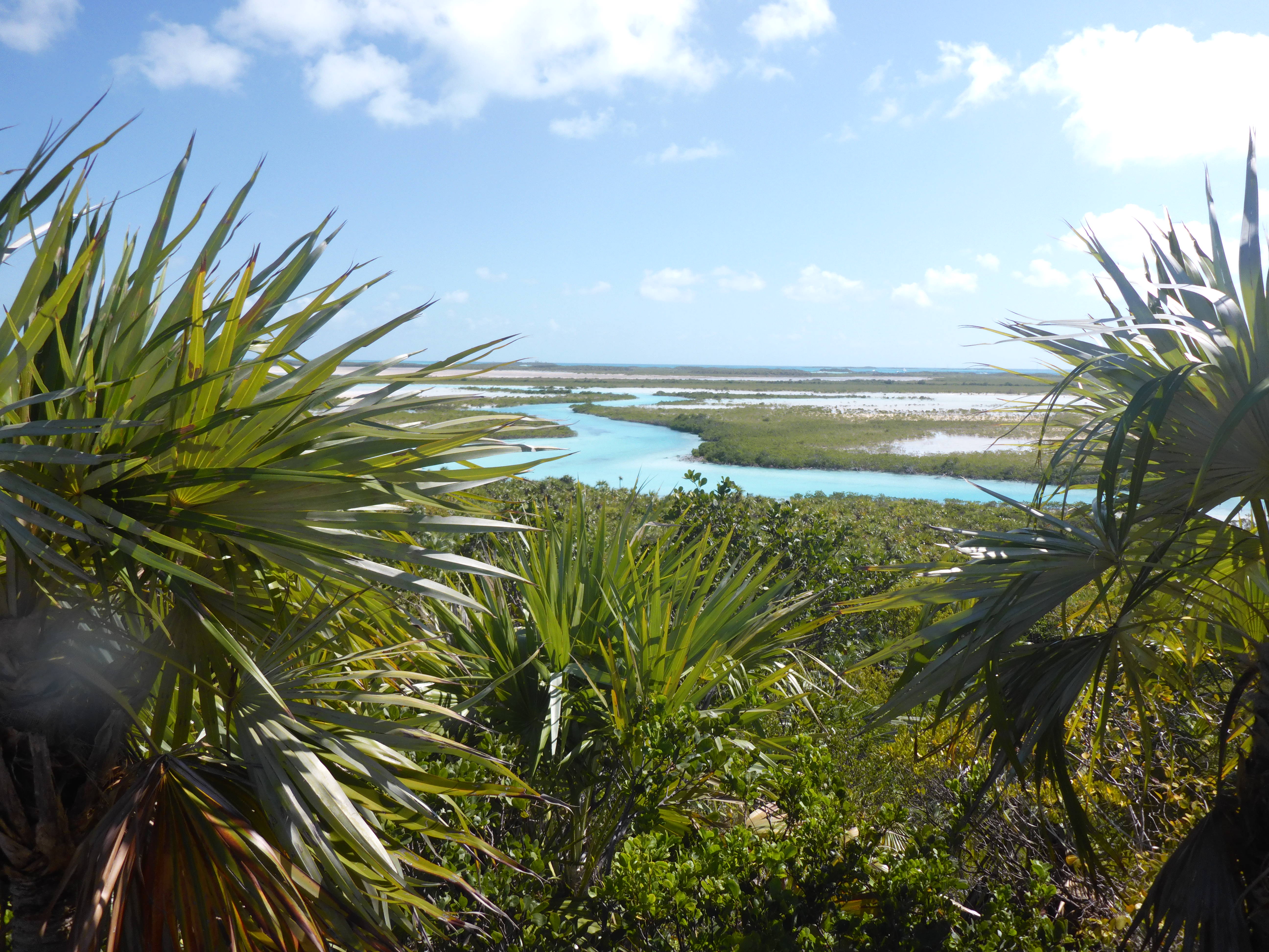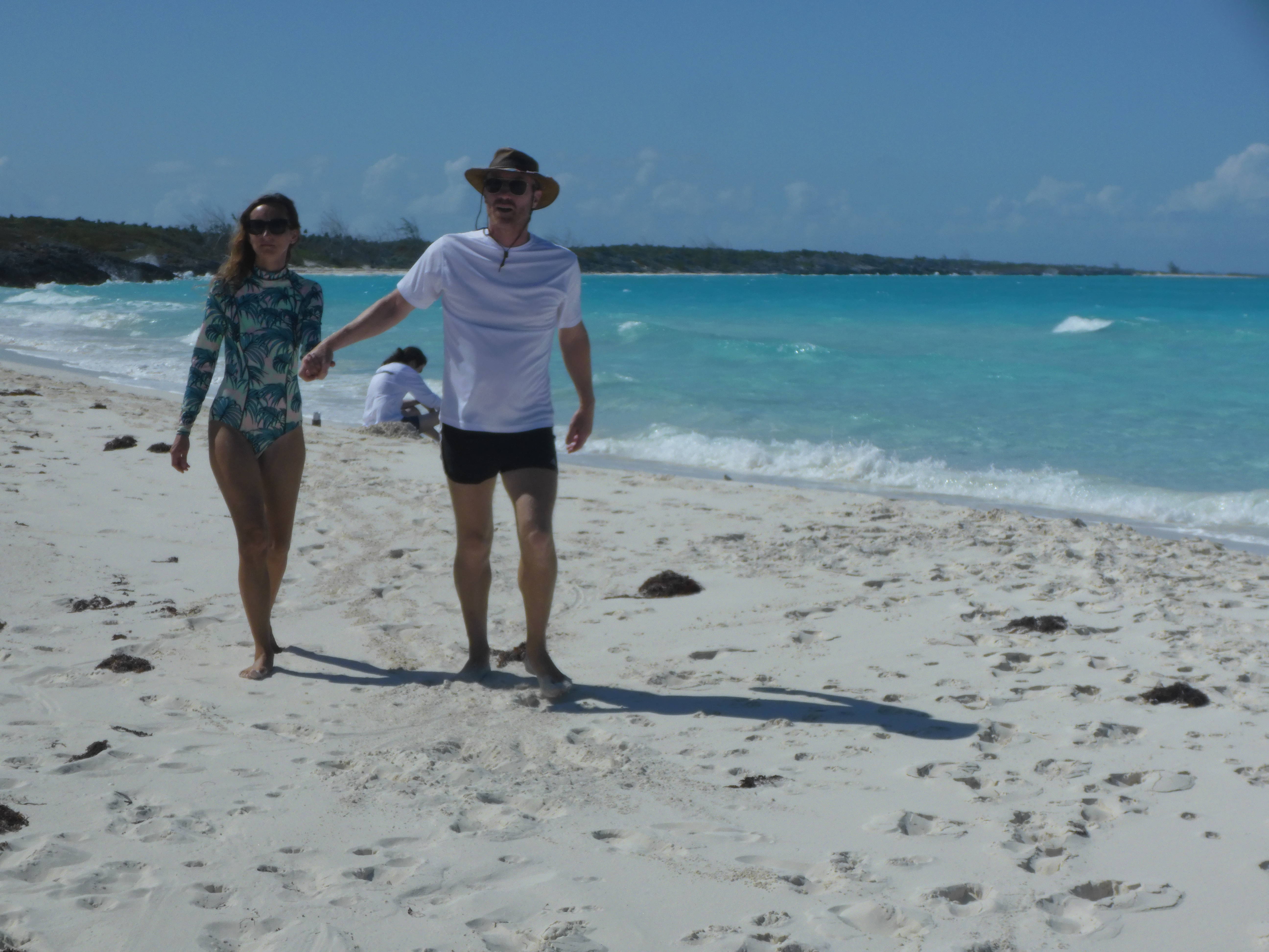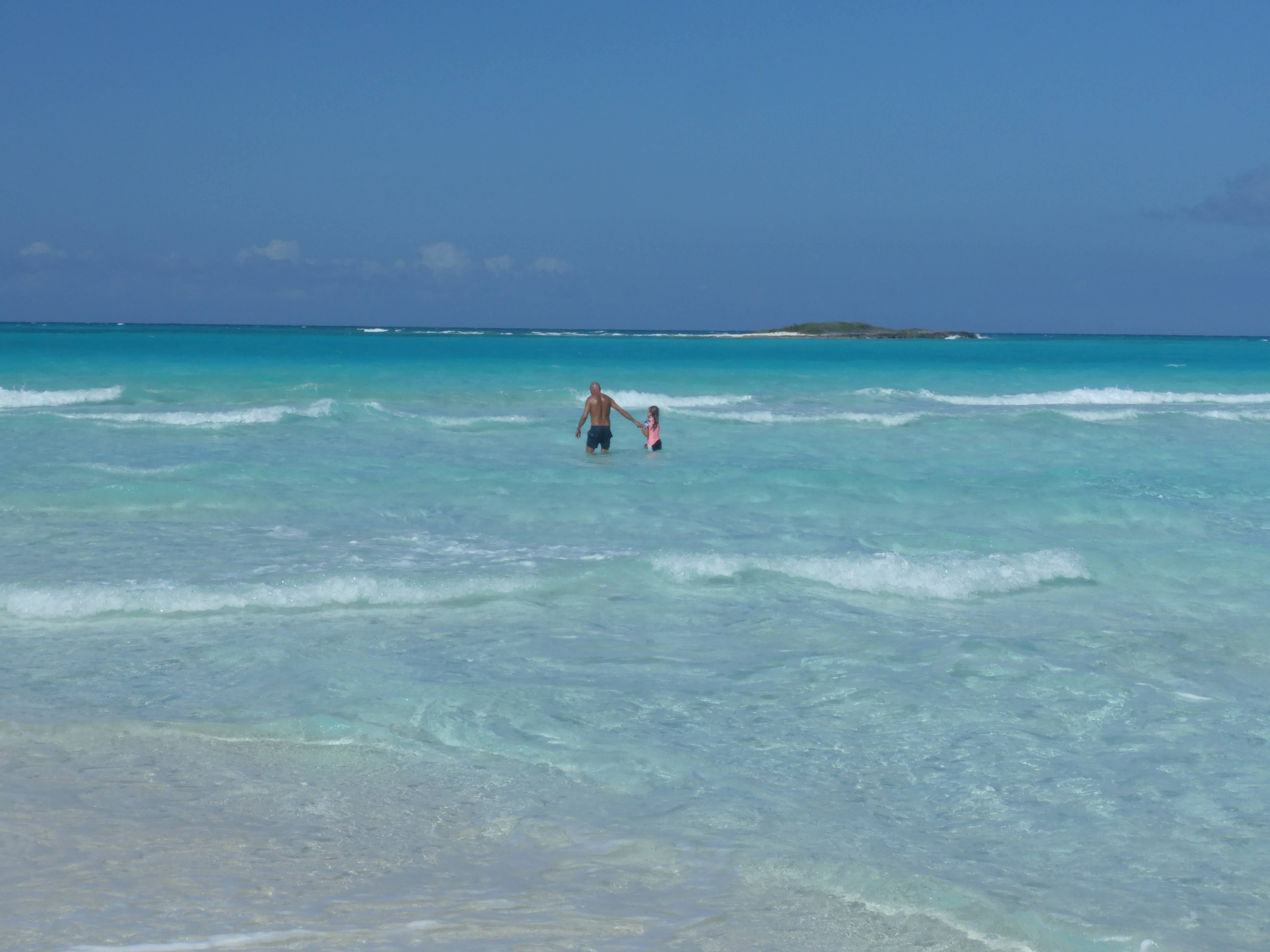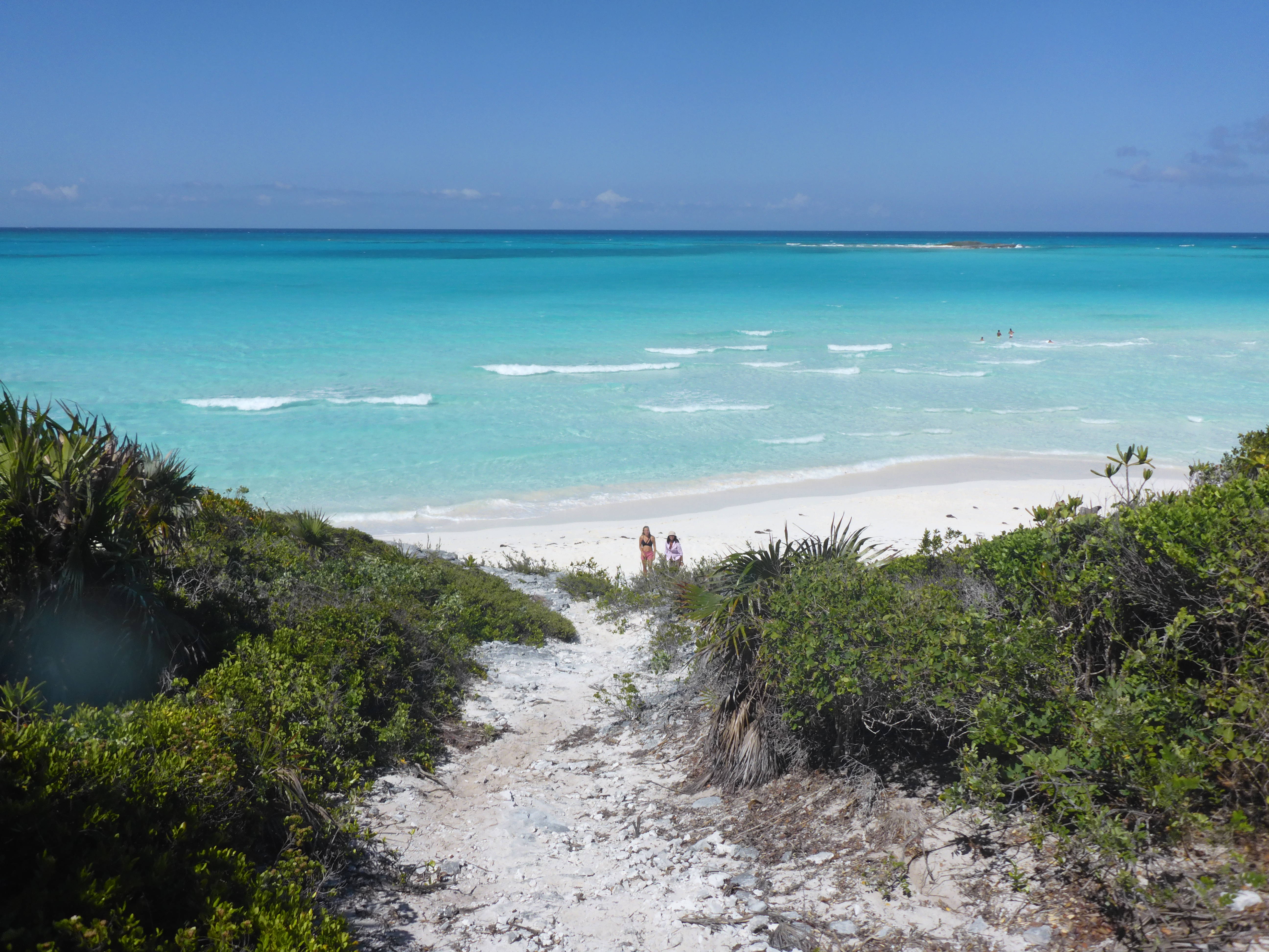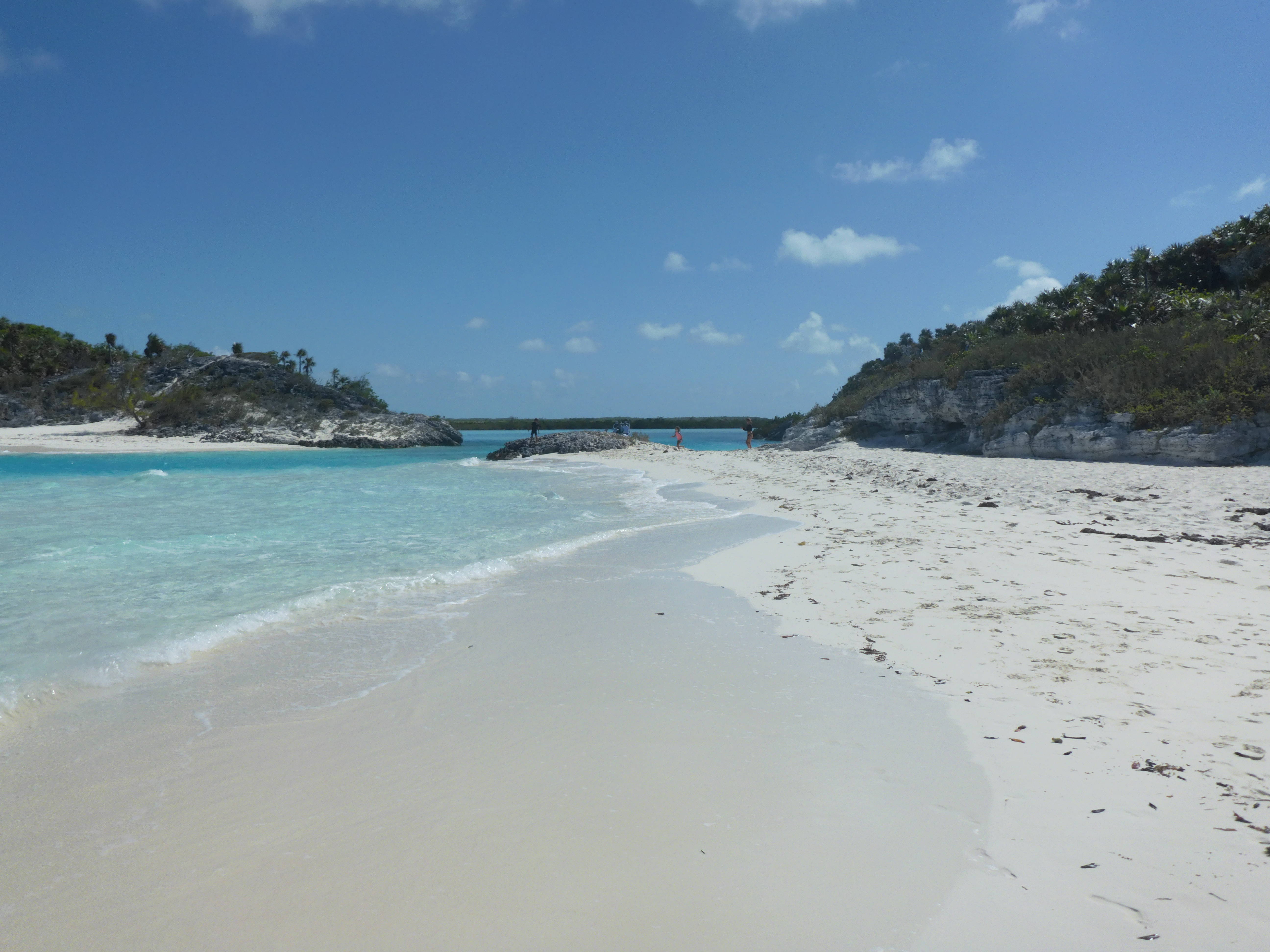 Am Ziel sehen wie den Atlantik auf der anderen Inselseite. Camp Driftwood ist der – kaum 15 Meter hohe – Hügel gleich neben dem Einschnitt in die Insel. Da hat die US DEA in den 80er Jahren einen Beobachtungsposten zur benachbarten Insel, auf der ein bekannter Drogenbaron seine Geschäfte tätigte. Und die Wash-Machine? Ist hier der Einschnitt. Kräftige Strömung an der Engstelle wird dazu genutzt, sich einmal (oder auch öfter) durchziehen zu lassen. Wir sind bei auflaufendem Wasser da und springen auf der Atlantikseite rein und lassen uns rein ziehen…