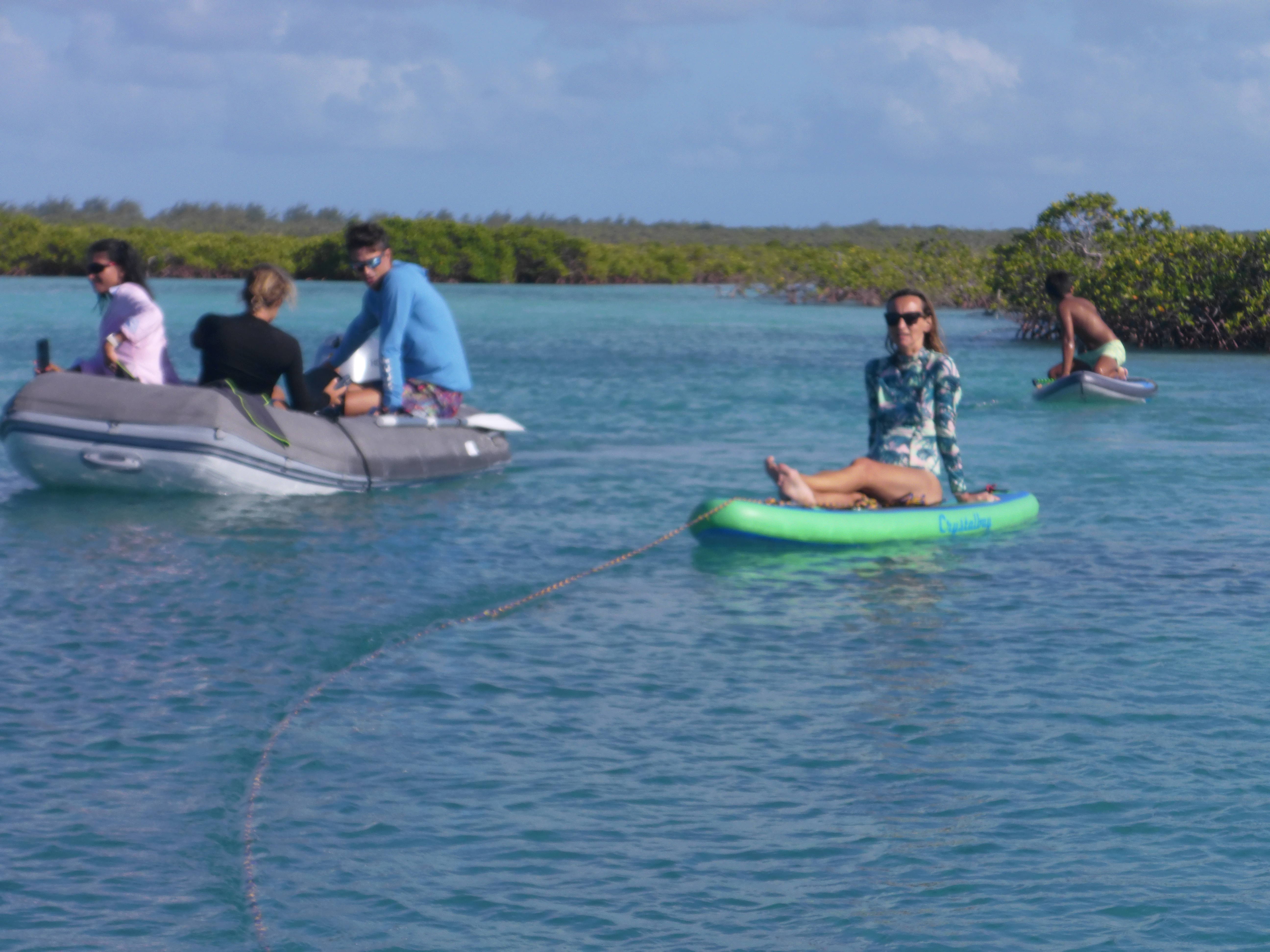 Wir fahren durch ein ausgedehnten Mangroven-Wald. Recht jung noch, nichts ist höher als 2 Meter. Die Kinder werden auf dem SUP hinterher gezogen und machen eine Menge Blödsinn. Gut – Peter auch, kaum steht Anna, gibt er Vollgas und versucht sie runter zu werfen.