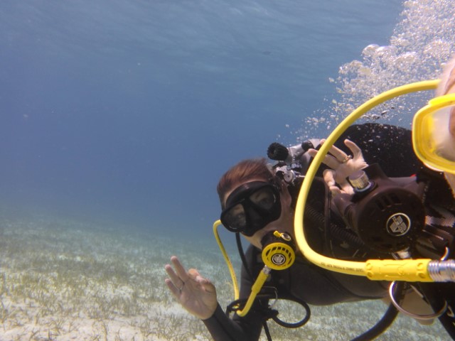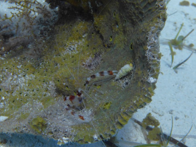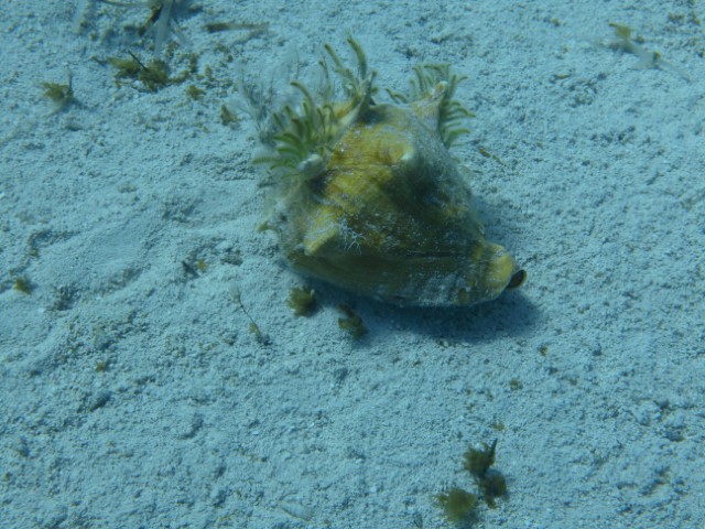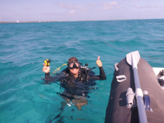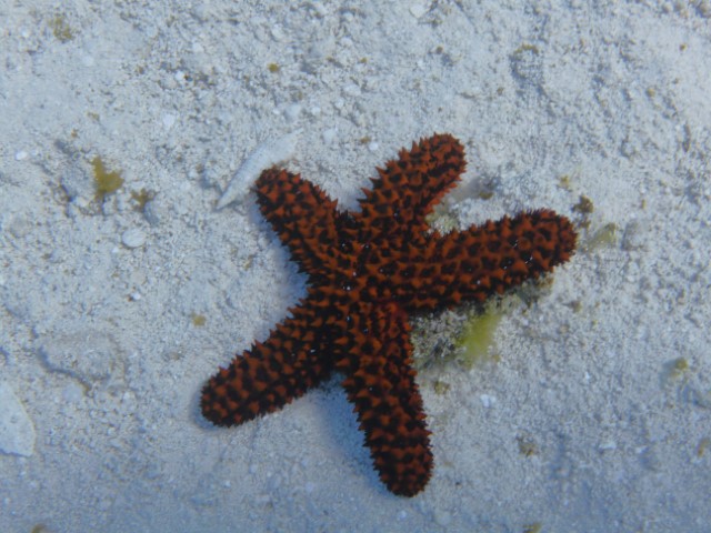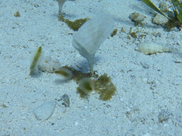 Der Tauchspot ist nicht gut bezeichnet. Und überhaupt. Es wird ein Strömungstauchgang. Heißt: Wir werden ins Wasser springen und uns von der Strömung treiben lassen. Das bedingt dann gleichzeitig, dass einer im Dinghy bleibt und der Taucherboje folgt. Nach der Beschreibung soll es bis auf 11 Meter gehen. Laut GPS sind wir genau auf der Stelle, aber wir finden nur 4,8 bis 6 Meter Wassertiefe vor. Am Anfang gehe ich mit Nathalie auf Kurs. Wir versuchen den „Abgrund“ zu finden. Doch ergebnislos. Dann konzentrieren uns auf Kleinigkeiten. Blau-durchsichtige Fischlein der 3 – 10 Zentimeterkategorie verschwinden vor uns. Dann kapiere ich endlich: Die haben keine Höhlen und schießen auch nicht so weit weg. Nein: Sie tauchen in den Boden ein. An bestimmten Stellen haben sie neben einer winzigen Koralle den Boden so gelockert, dass sie da einfach untertauchen können. Zack – weg sind sie. Das werde ich dann filmen, wenn ich mit Anna unterwegs sind. Mit Nathalie finde ich einige Sand-Dollars. Leider gehen von den dreien in meiner Hand beim Auftauchen schon zwei kaputt. Nathalie hat 5. Davon gehen dann aber 3 kaputt, als sie sie ins Dinghy legt. Und von den verbleibenden dreien tritt sie dann auf RE in zwei weitere. Ach – ich hätte doch so gerne einen schönen, großen Sand-Dollar! Nun bleibt mir nur noch ein kleiner, noch gar nicht „fertiger“.