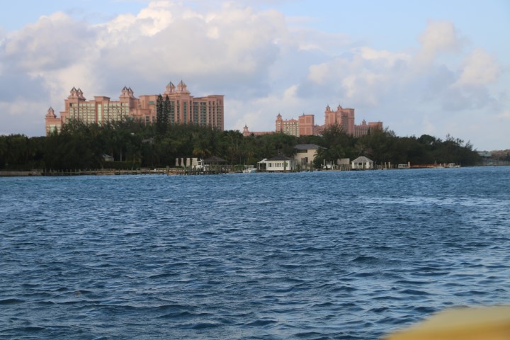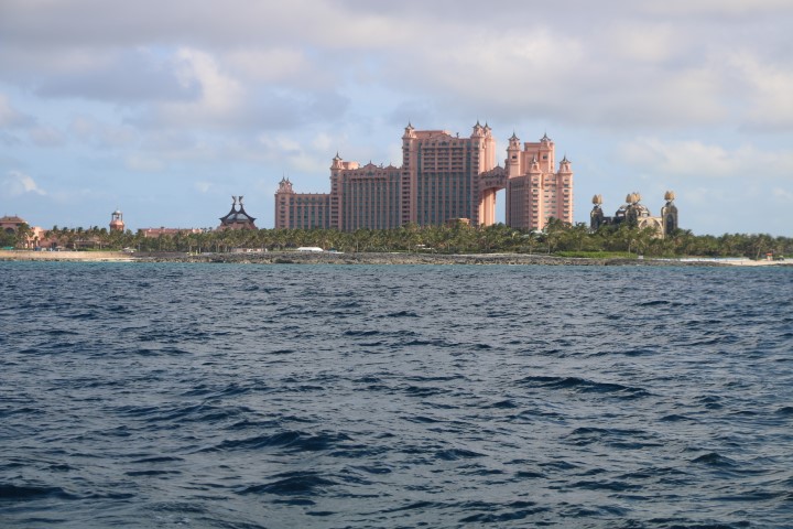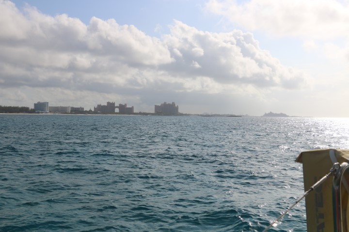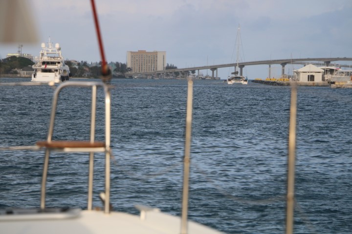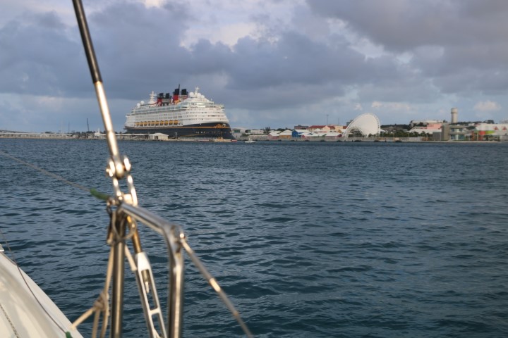 Das Einlaufen in den westlichen Teil Nassau gestaltet sich schwierig. JUNE und RE müssen warten, dass ein Kreuzfahrer ausläuft. Dann sollen wir schnell hinein schlüpfen, denn der nächste Kreuzfahrer will bald los! Klappt, ich tuckere hinter JUNE her. Doch im inneren Teil des Hafens, wo VITAMIN SEA noch einen erträglichen Ankerplatz gefunden hat, ist für uns beide nur wenig Platz. Ich versuche es, aber hier setzt Strom gegen Wind und RE segelt ständig um den Anker herum. Das sehe ich gut an der kleinen Anker-Boje. Mal steht sie rechts, dann links, dann wieder vorn. Dann ist sie weg. Ich schaue zwischen die Rümpfe: Auch nicht! Nein – jetzt ist sie sogar hinter RE! Und da der Abstand zu den anderen Booten gerade mal 50 Meter beträgt, beschließe ich in den äußeren Hafen zu gehen. JUNE ist da angekommen und meldet: Ordentlich Platz, ordentliche Verhältnisse!