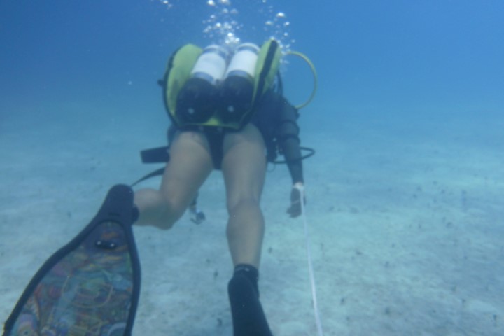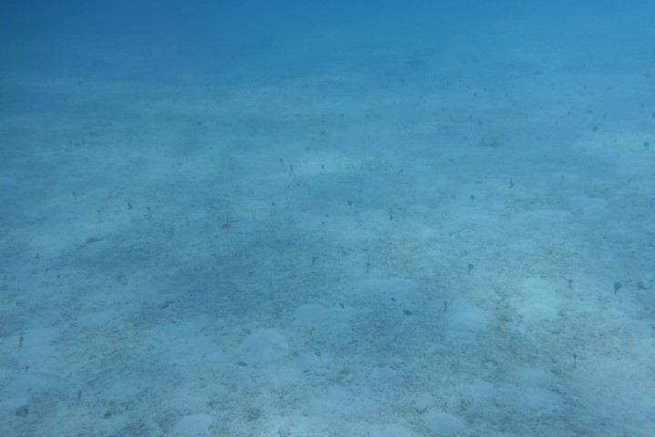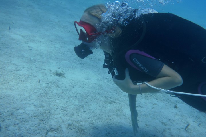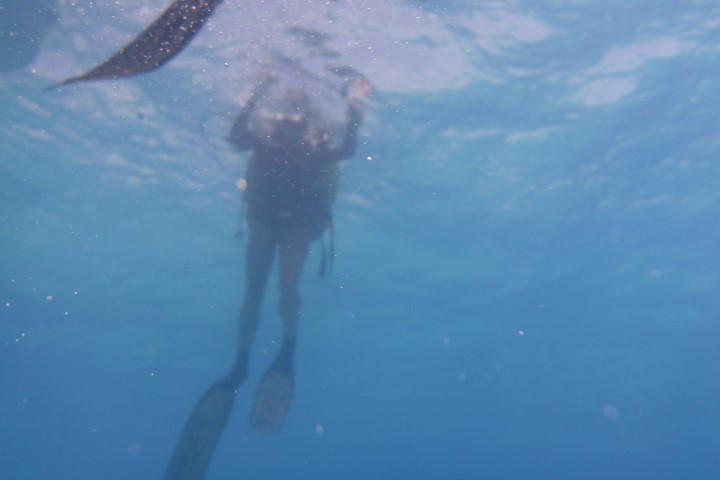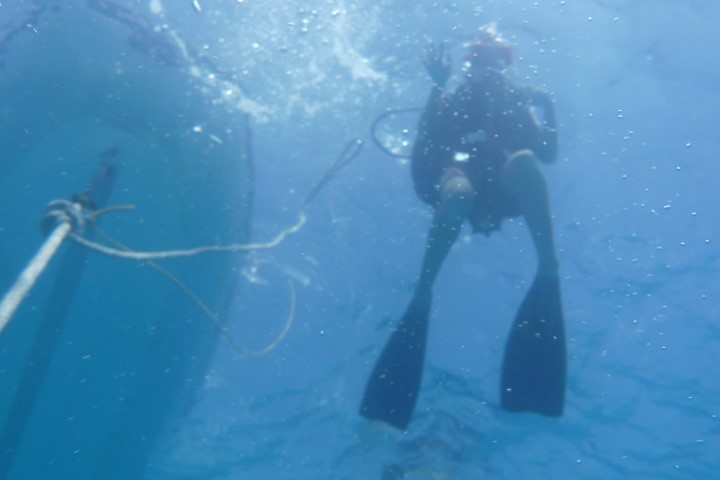 Die Fahrt raus gegen Wind und Wellen sind nicht so spaßig. Ab ins Wasser, doch von den versprochenen 12 Metern sind hier nur 6 Meter da! Topfflacher Boden. So gut wie nichts zu betrachten. Wir tauchen in die Richtung, die es blauer wurde. Aber passieren tut da nichts! Also zurück. Ich lasse die Mädels unten zurück, steige ins Dinghy, hole das Grundgewicht hoch und nehme das Dinghy als Boje an langer Leine in Schlepp. So schwimmen wir knapp über dem Grund einfach mal los. Und finden: nix. Also – beim letzten Tauchgang war dann ja noch im Kleinen Vieles zu entdecken. Aber hier: NIX! Irgendwann meldet Anna: Kalt! Wir tauchen auf. Auch Nathalie sagt, es war gut, aber mehr braucht auch sie nicht.