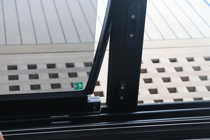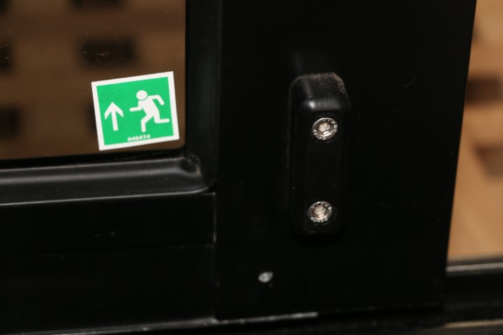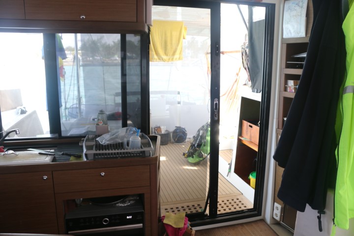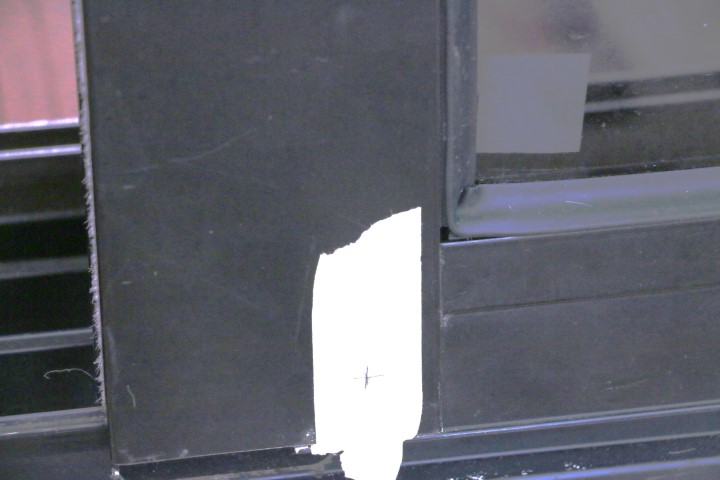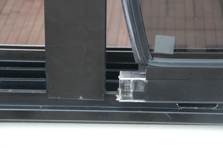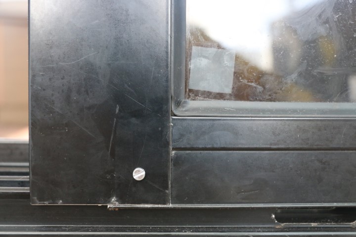 Dann endlich geht es ans Tür reparieren. 2 T-Shirts schwitze ich durch. 31° innen, über 34° außen. Die Schwierigkeit ist schnell entdeckt: Das Dichtgummi der Glasscheibe verhindert, dass ich sie einfach wieder zurück schieben kann. So muss ich mit einem schmalen Messerchen Zentimeter für Zentimeter das Dichtgummi auf die Scheibe heben und kann die dann wieder ein Stückchen rein schieben. Geduldsarbeit. Doch am Ende sitzt die Scheibe wieder im Rahmen und der ist geschlossen. Zur Sicherung bohre ich ein Löchlein, schneide ein Gewinde und platziere eine Sicherungsschraube. An dieser Stelle wird der Rahmen nicht wieder aufgehen!