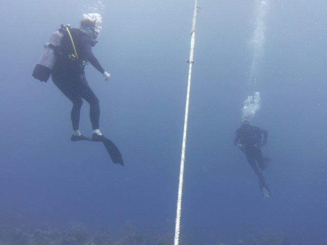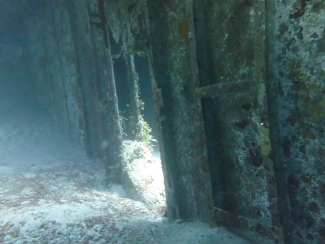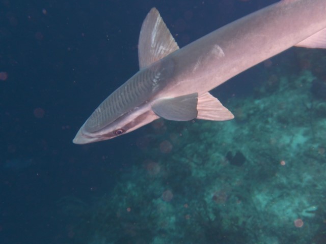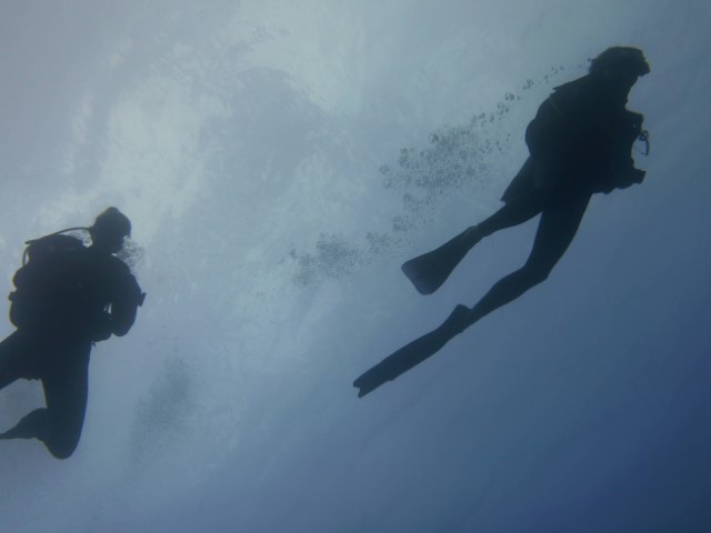 An der Kante oben dann zurück. Eine Menge Haie kommen vorbei. Leider ist das Wasser eher trüb, die Fotos und Filme könnten besser sein! Die Wracks laden zu einem zweiten Besuch ein. Am Ende machen wir noch in 6 und 3 Metern eine kurze Deko-Pause. Unter der KISS tummeln sich zwei Schiffshalter. Sie scheinen zu überlegen, ob wir gute Wirte wären. Aber dann entschließen sie sich doch lieber, zu bleiben…