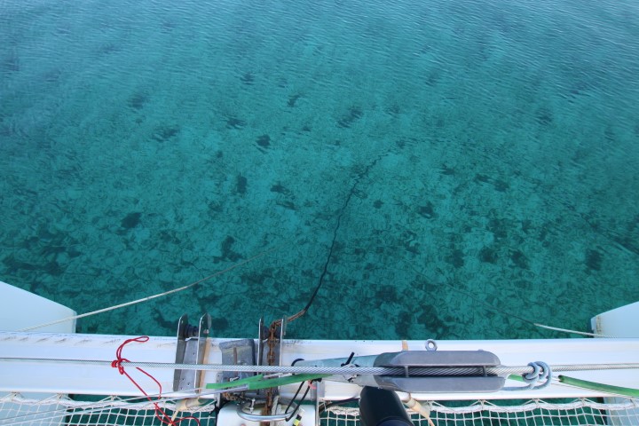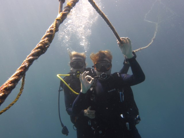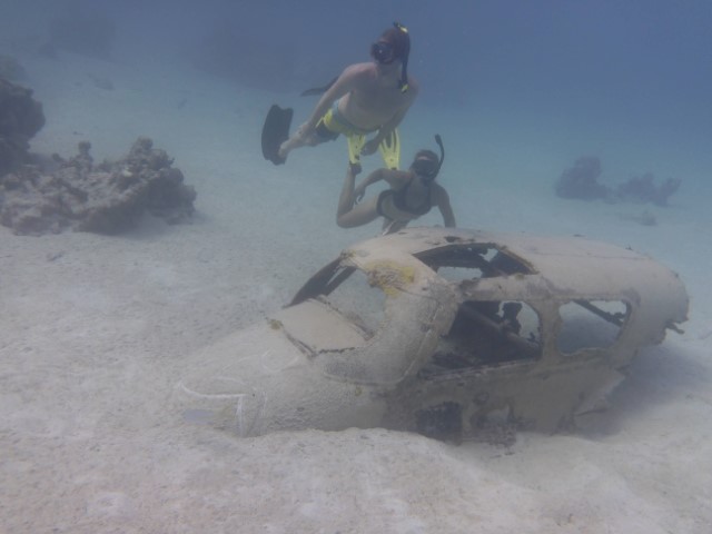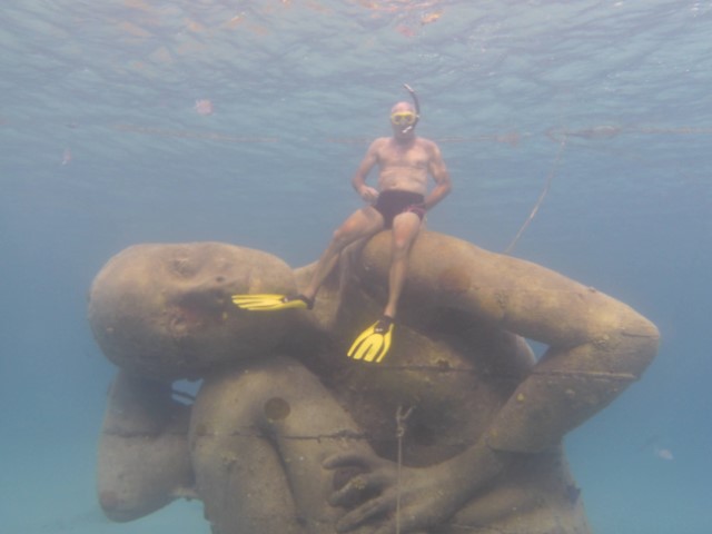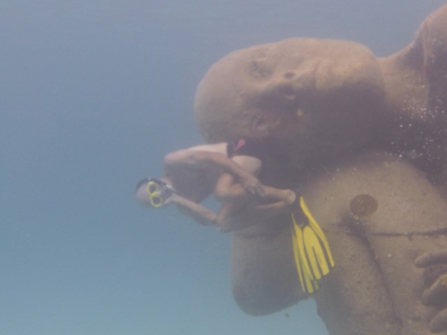 Eine kleine Pause mit Verpflegung und dann verlegen wir an einen weiteren Spot. Dort schnorcheln wir wieder. Dort gibt es eine Statue – 60 Tonnen, unter Wasser zusammengesetzt. Wir wollen einen japanese stop machen. Es wird ein wenig länger, aber Fotos haben wir dann am Ende eine Menge! Und ja: Es ist gar nicht so einfach, die Pose nach zu machen…