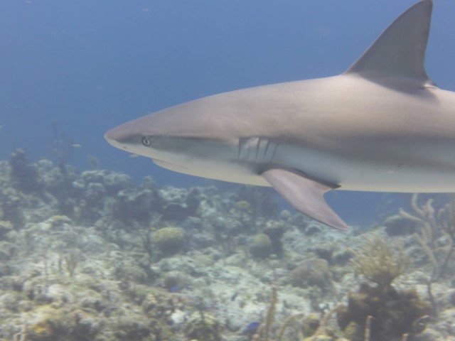 Der Morgen bringt spiegelglattes Wasser. Klar, dass ich den Anker fotografieren muss… Nun – dann mache ich mich an einige Büroarbeit und Mathe mit Anna, bevor wir starten: Heute fahren wir – insbesondere, weil unser 2. Ziel weiter weg ist, mit dem „Großen“, sprich mit der KISS raus. Zur Vereinfachung kommen sie kurz längsseits, übernehmen meine Gerätschaften und mich. Zunächst gehen wir an ein wirklich schönes Wrack. Und Haie wird das bestimmende Thema des Tauchganges. Neben uns liegen einige Tauchschulen und träufeln Fischblut ins Wasser. Zack – sind sie da!