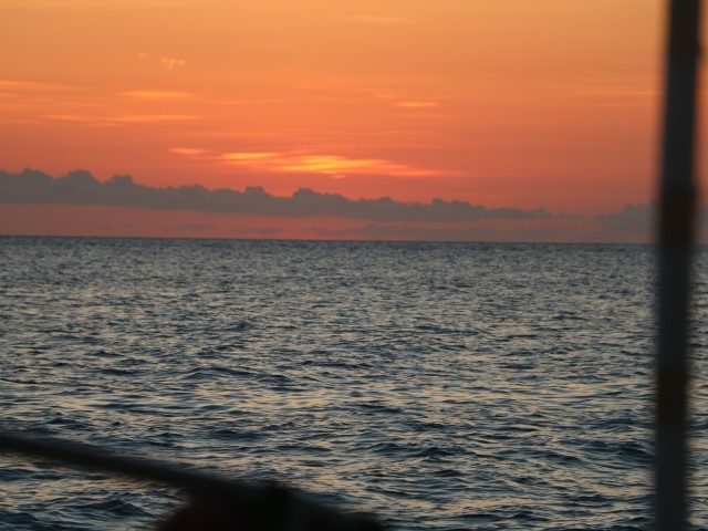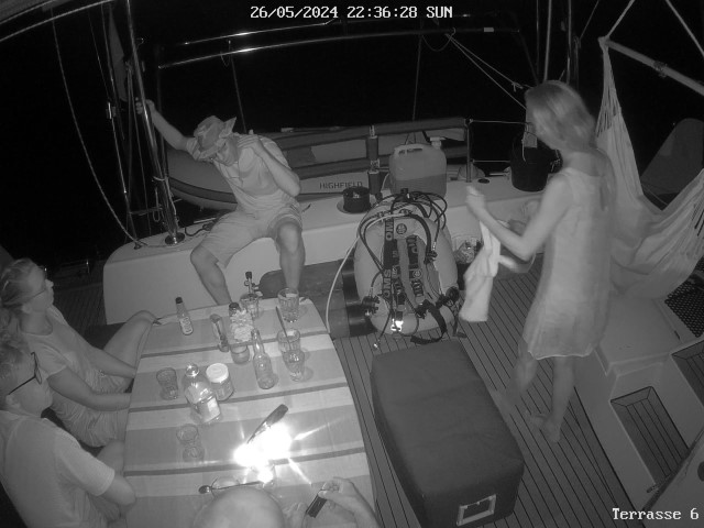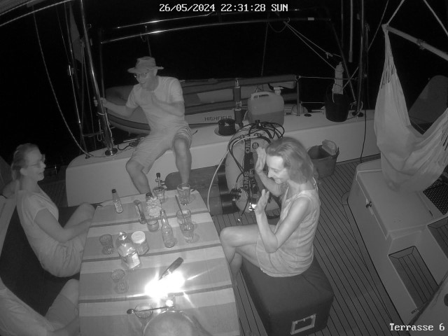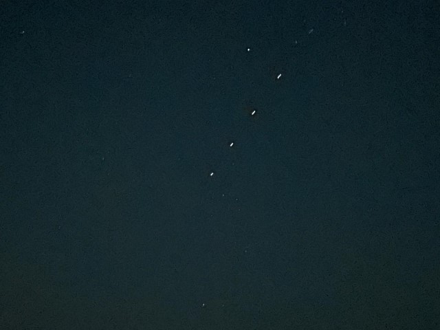 Gegen Abend biegt die VITAMIN SEA in die Bucht ein. Ein fröhliches Wiedersehen mit verspätetem Sundowner. Anna alarmiert uns. Eine unglaubliche Sternen-Konstellation im Himmel. 12, 13 oder sind es 14? leuchtende Punkte ziehen am Himmelszelt hoch. Dann wird klar: Eine Starlink-Kette. Gerade noch beleuchtet von der Sonne, leider kommen wir zu spät auf den Gedanken, das zu fotografieren. So sieht man nur noch 4 davon….