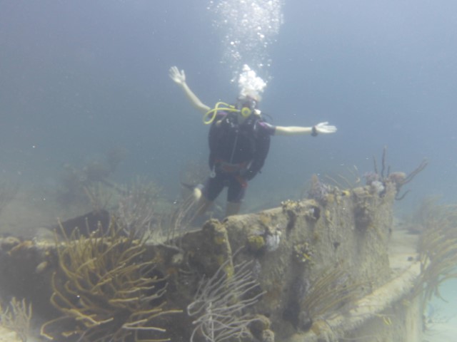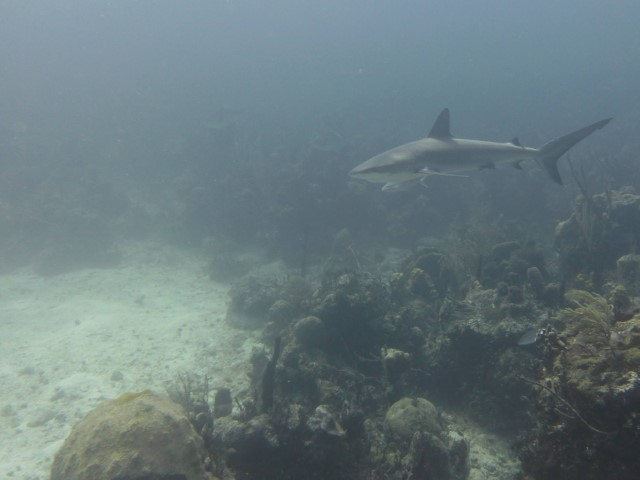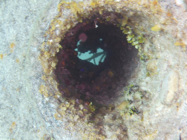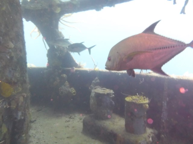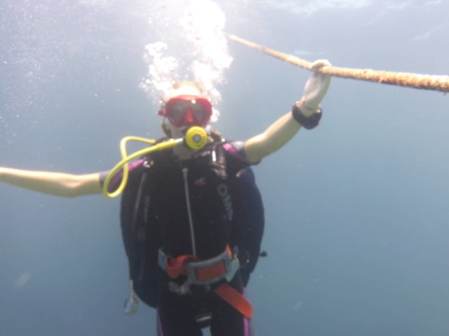 Wir machen an der schon bekannten Mooring fest. Anna bekommt eine Einweisung in die lokalen Gegebenheiten und die Taucheruhr. Schritt für Schritt muss sie immer selbstständiger werden unter Wasser. Anne und Philipp gehen direkt zu den Wracks. Wir beide gehen erst an die Kante und auf 18 Meter. Sozusagen Annas erster Tieftauchgang. Sie hält die 18 Meter prima – unter uns geht es ja noch weitere 2.000 Meter abwärts. Haie begleiten uns wieder, dann entdecken wir einen Riesen-Hummer und eine grüne Muräne.