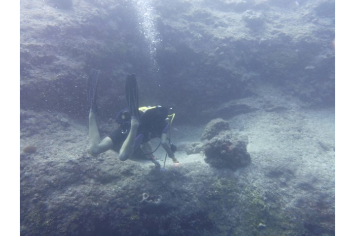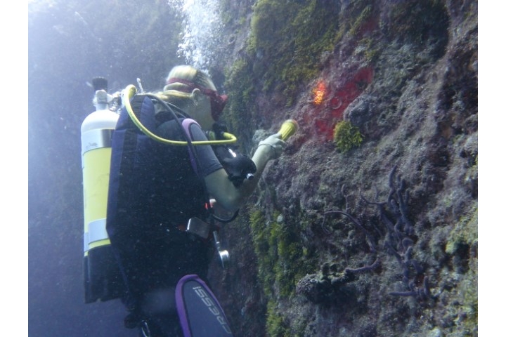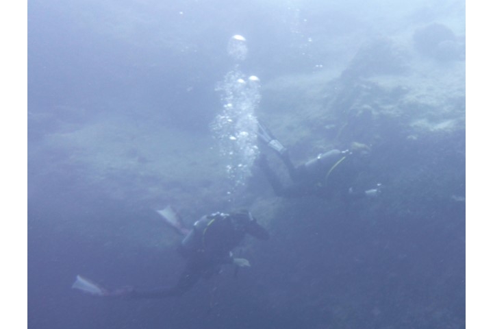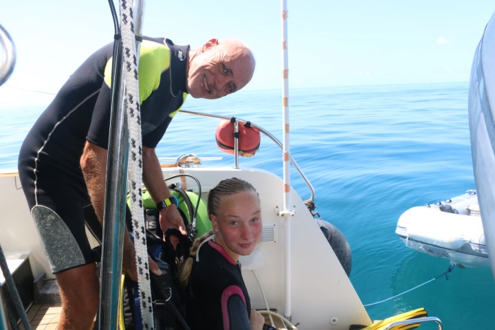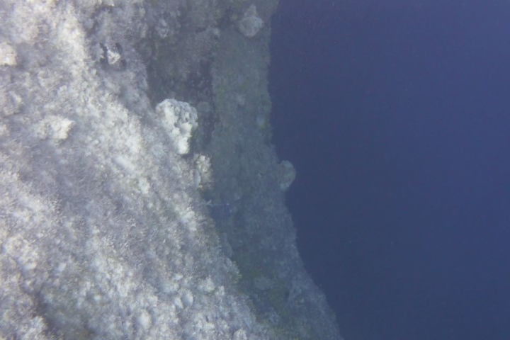 Doreen bringt Anna. Und macht dann eine nette Reihe von Fotos, wie wir ins Wasser gehen. Nach wenigen Metern sind wir an der Kante ins dunkle Blau! Dort treffen wir Anne und Philipp. Gemeinsam geht es abwärts. Plan: Rasch auf Tiefe, für Anna: 21 Meter. Dann in Spiralen an der Wand wieder nach oben. Anna möchte gerne die 25 Meter „knacken“. Im Briefing sage ich das nicht zu – es sollen am Rand Höhlen sein, ich kenne das Revier nicht. So verabreden wir, dass ich 25 anzeige, wenn ich es für ungefährlich halte. Die Höhlen entpuppen sich als Überhänge, ungefährlich! Der Weg nach oben ist nirgendwo versperrt. Also darf sie ihre Marke „machen“.