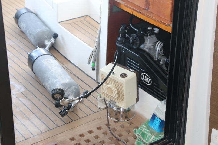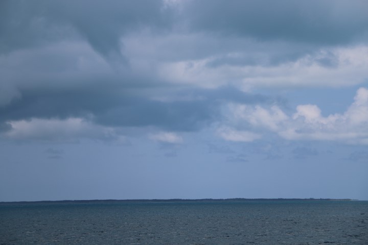 An Bord versammelt sich alles. Für die KISS fülle ich noch schnell die Flaschen, meine kommen nachher dran. Denn VITAMIN und KISS wollen am Nachmittag noch ca. 30 Meilen nach Süden. Da kommt Philipp angesprungen: Windhose. Oh weh – ja! Sie scheint genau auf uns zu zu ziehen. Doch bis ich den Fotoapparat klar habe, ist sie zusammen gefallen. Und man muss schon genau schauen, um den oberen Teil auf den Fotos zu erkennen….