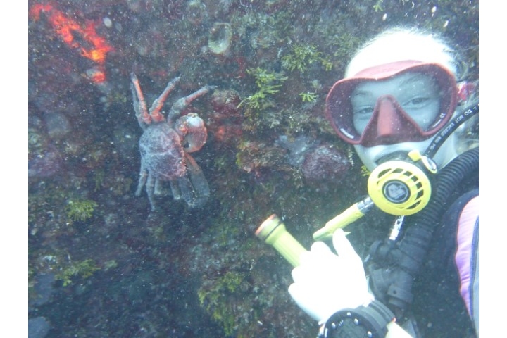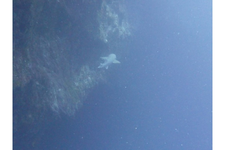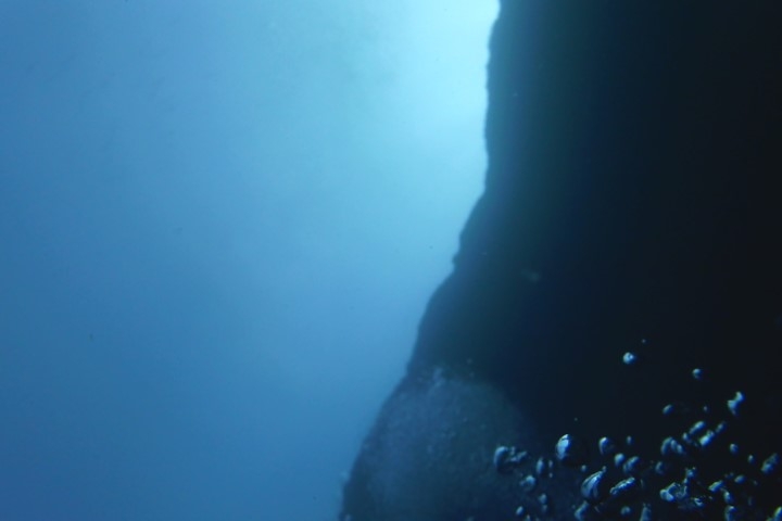 Die Idee in Spiralen dann aufzutauchen erweist sich als wunderbar. Drei oder viermal kreisen wir im Hole. Sehen einen Hai – der dreht auch so rum wie wir. Einen Hummer, einen riesigen Krebs. Und immer unter uns noch die Dunkelheit – es geht hier bis über 50 Meter runter! Und neben und über uns der Rand ins Himmelblau über uns!