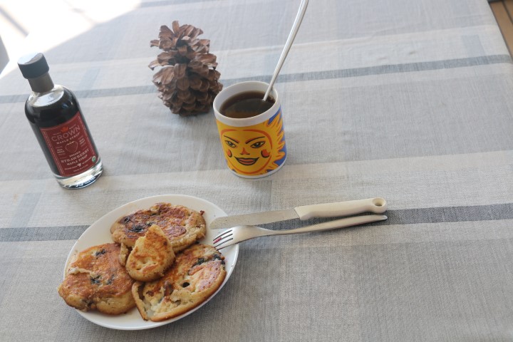 Den Anfang des Tages gestalte ich „amerikanisch“: Es gibt Pancakes mit Ahorn-Sirup (ich weiß: Das ist auch nur Zucker…). Aber ich mixe eine Handvoll frische Blaubeeren mit hinein. Macht sich gut!