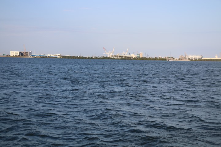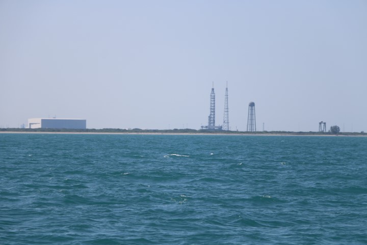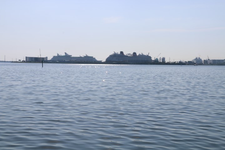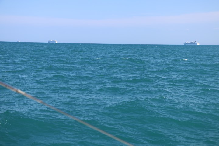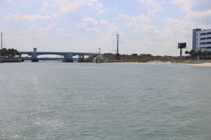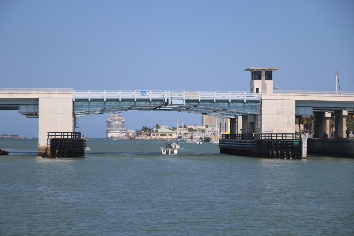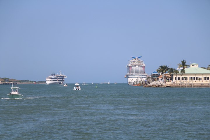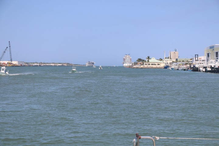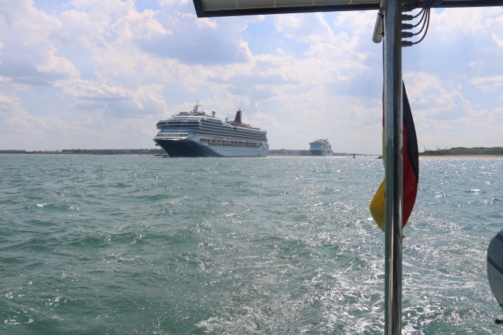 Vor der Brücke muss ich kurz Gas raus nehmen, dann ist sie schon auf. Im langgestreckten Hafenbecken von Port Canaveral werde ich auf den letzten Metern von 3 (!!) Kreuzfahrern gejagt. Ich gebe (ziemlich) Vollgas auf beide Motoren, da kommt backbord der Lotse nah. Ich soll doch mal auf Kanal 12 kommen. Ja – das ist der Pilot-Channel und da wollen wir … Ob ich mich verdrücken könne? Klar – ich geh gleich nach der Mole aus dem Fahrwasser. Er will mich nach rechts raus habe, ich möchte aber nach links, denn sonst muss ich noch auf alle 3 warten, bis ich auf „meine“ Seite komme. Nee, das geht nicht. Aber ich will nach Norden! Na gut – dann geh aber sofort ganz nach links im Fahrwasser. Kein Problem, wenige 100 Meter bin ich sowieso aus dem Hafen und raus aus dem Fahrwasser. So schnell holt mich auch der erste Kreuzfahrer nicht ein!