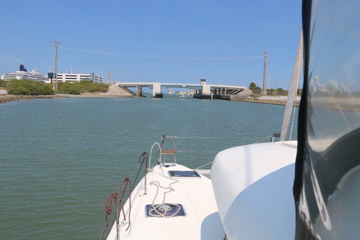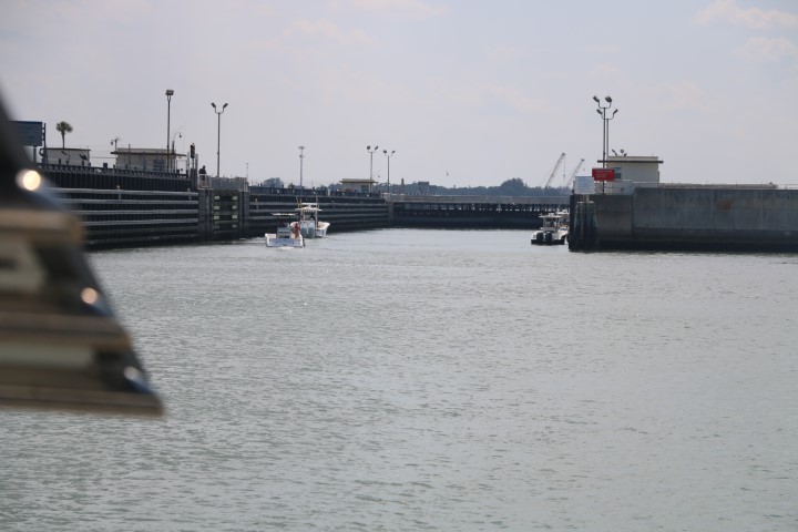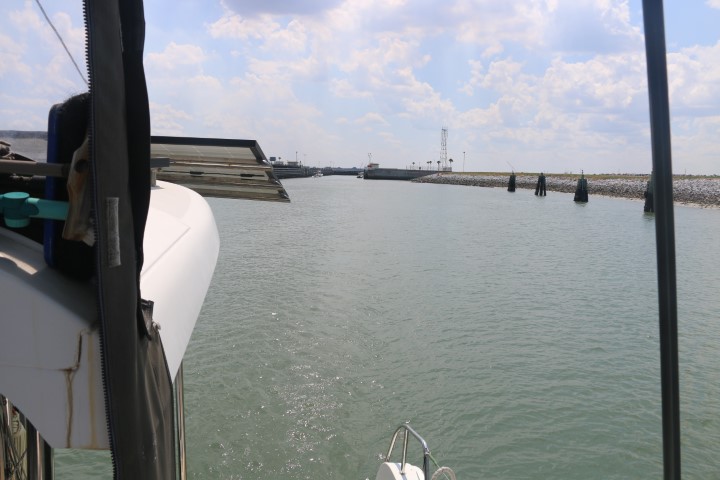 Für die Müllentsorgung muss ich dann noch eine Extra-Tour machen, da wo ich gelandet bin, liegt der Müll nur im Gelände. (Make America clean again! Das wäre eine Sache!) Gegen 15 Uhr bin ich klar und gehe Anker auf. Und dann passt es alles nahtlos zusammen: Die Schleuse macht in dem Moment auf, als ich ankomme. Kaum habe ich das Tor passiert, beginnt es schon zu schließen. Und die lange Zeit, die ich in der Schleuse für letzte „Ozean-Vorbereitungen“ nutzen wollte, ist heute sehr kurz: Ich schaffe es gerade, das LasyBag los zu bändseln und das Groß „klar zum“ zu machen und den Anker seefest zu zurren, da sind die anderen Schleusentore schon auf.