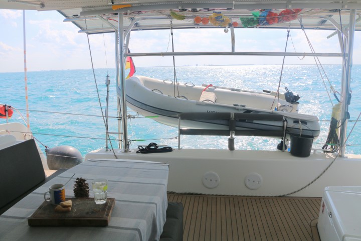 Der Start an Bord gestaltet sich schwierig. Ich lasse das >Dinghy zu Wasser und schließe dann ab. Fahrradkörbchen und Mülleimer in die Hand und – eh! Das Dinghy ist weg! So 10, 15 Meter hinter RE schaukelt es langsam Richtung Ferne. Sch…. Das ist mir noch nie passiert. Ich habe die Vorleine nicht belegt. Die Zeit mich auszuziehen und Badehose an habe ich nicht gestoppt. Aber ich bin sicher, es war unter 5 Sekunden. Dann rein ins Wasser. So weit ist es nicht, da klettere ich nicht in Dinghy, sondern ziehe es schwimmend zurück. Dieses Mal wird die Vorleine belegt. Dann gibt es eine Dusche. Und bald darauf geht es nun wirklich los.