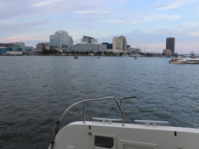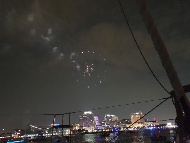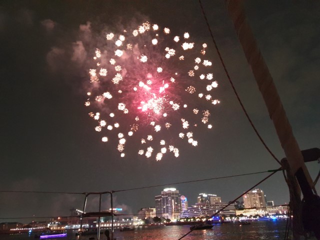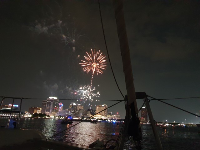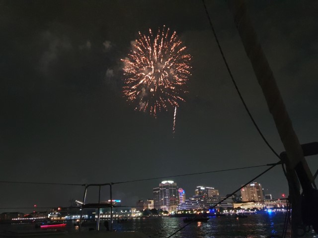 Pünktlich um 21:30 Uhr beginnt ein großes, langes (über 20 Minuten) und schönes Feuerwerk. Die Anchorage ist der Idal-Platz. Ich glaube, nirgendwo kann man das Feuerwerk besser betrachten. Manchmal habe ich Sorgen, dass die Reste bis zu uns Ankerliegern kommen müssten. Aber dann kommt der Physiker in mir und sagt: Das läuft parabelförmig, die Reste fallen immer steiler ins Wasser. Und der Wind treibt es quer zu uns – und damit an uns vorbei. Riesenjubel am Ende – auch ich klatsche, auch wenn es niemand hören sollte – hier kann man es nachlesen! Und ich will auch nicht über Luftverschmutzung nachdenken – es war einfach schön! Und auf die USA kommen nun schwierige Zeiten zu. Ich habe das erste Fernseh-Duell Biden – Trump gesehen. Sehr schwere Zeiten! Gut, dass ich hier nicht wählen muss!