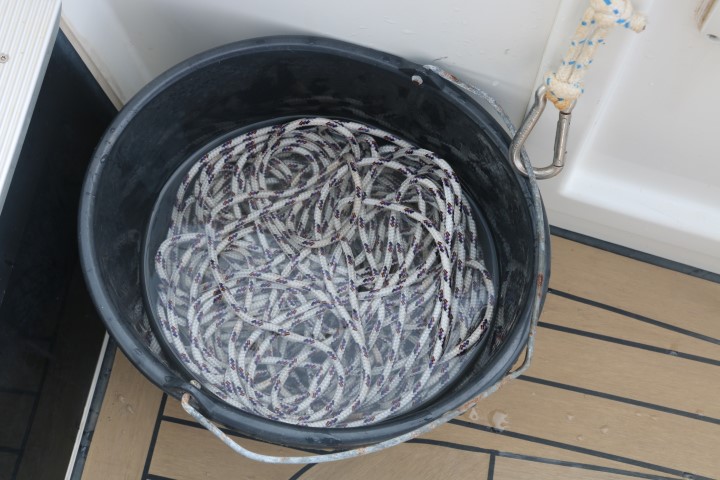 Gut – mit dem Chrome-Putzen komme ich langsam zu den „Kleinigkeiten“. Heute sind die Griff-Stangen auf der Terrasse dran. Das ganze Wäsche-Trocknen-Seil abmachen und auch dieses säubern: Entsalzen. Und dann die Stangen – das geht schnell, so ohne Seil. Damit ist klar: Nächster Arbeitsschritt das Seil wieder spannen. Und dabei fallen dann auch die dreckigen Flächen auf der Dach-Unterseite auf…..