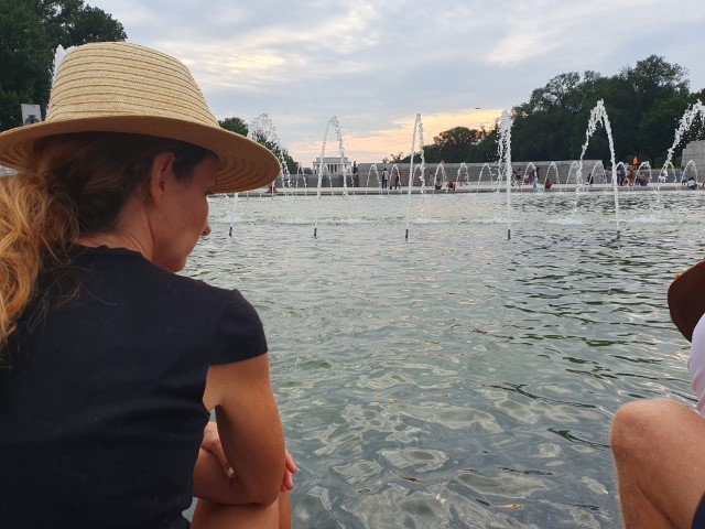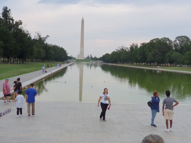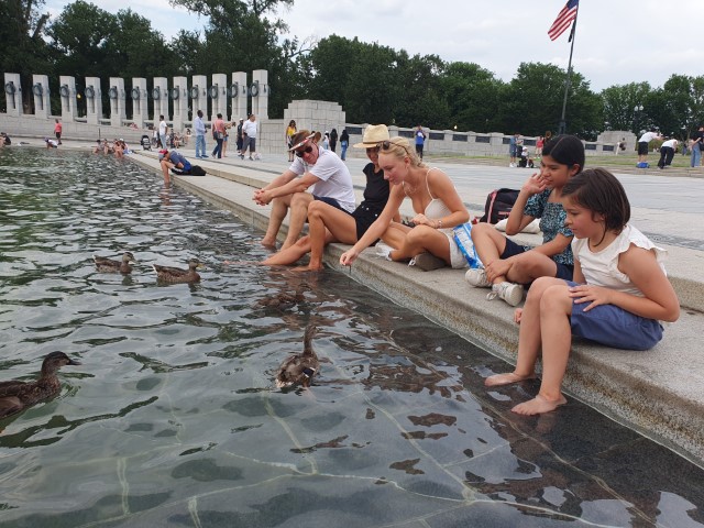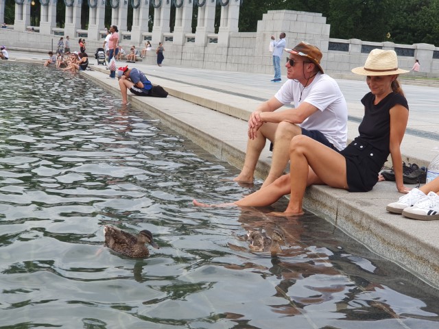 Das Monument umrunden wir brav einmal und schlendern zum Reflecting Pool. Baden unsere Füße darin. Bis Anna auf die Idee gebracht wird, die Enten nicht nur zu füttern, sondern zu fangen. Nun ist allseits und nicht nur bei den Kindern höchster Spaß angesagt. Die Enten können sich nicht so ganz entscheiden, ob sie gefangen werden blöder finden als gefüttert werden….