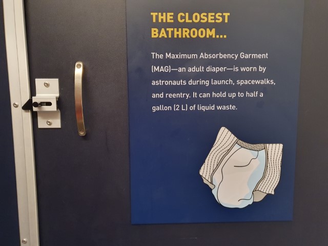 Selbst die Toiletten sind „Space – Museum“: Überall Informationen zu dem entsprechenden Ort auf der ISS und beim Start von Raketen….