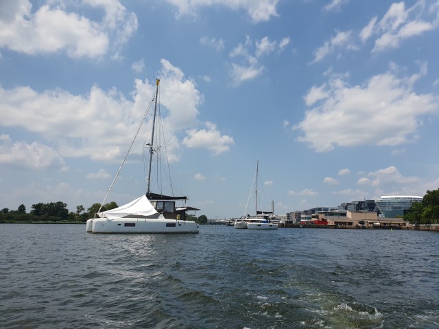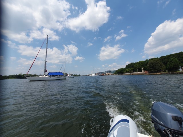 Dann eine Expedition nach "National Harbor". Das ist entgegen der ersten Annahme der Ortsname! Alle Ankerplätze in der Nähe von Washington inspizieren. Denn - hier darf man eigentlich nur 7 Tage liegen. Dann muss man für min. eine Nacht weg. Aber wohin? Am besten erweist sich da der Anascostia River - gleich um die Ecke. Alle anderen Ecken sind bedenklich flach...