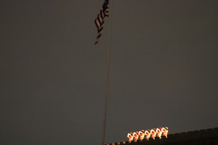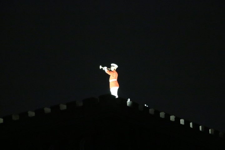 Gegen 20 Uhr kommt das Vorprogramm: Ein rot gekleideter Marine kommt unseren Aufstieg hoch und erklärt einiges und steht für alle Fragen offen. Mein nach dem roten Kleide ist einfach: Er ist Musiker. Die sind unbewaffnet. Waren sie schon im Bürgerkrieg schon und da kann man auch Kinder einsetzen. Sind dann keine Soldaten. Und jeder weiß, die sind unbewaffnet…. (Was nicht jeden davon hindert, auf die zu schießen!) Er wird von rundum Löcher in den Bauch gefragt.